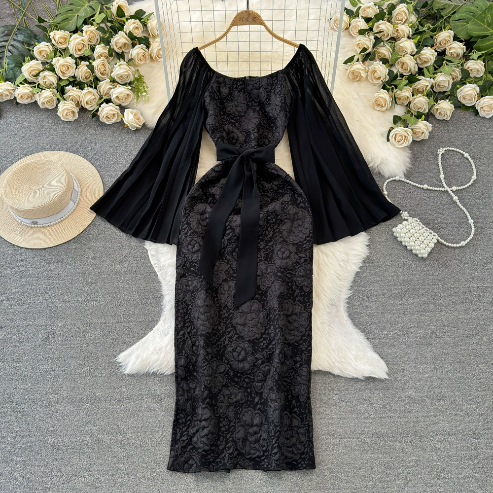 | nameOriginal | Socialite trumpet long sleeve lace up jacquard dress |