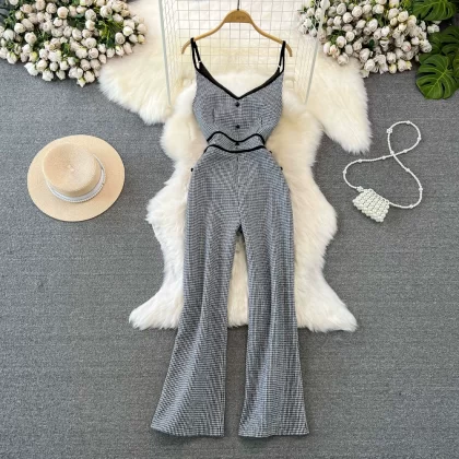 | nameOriginal | Socialite V-neck houndstooth wool high-waisted jumpsuit |