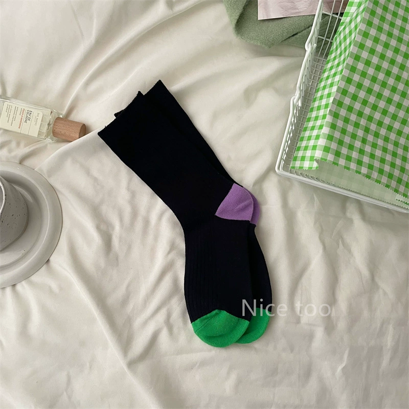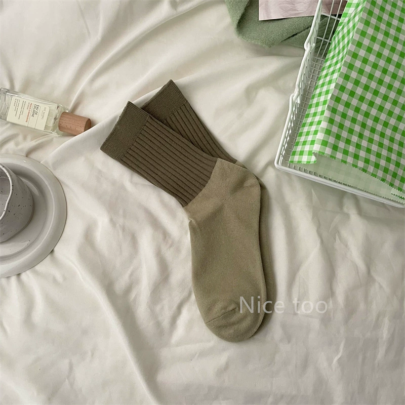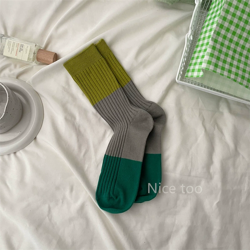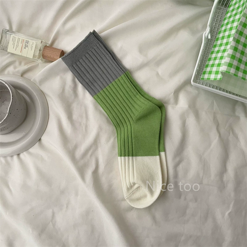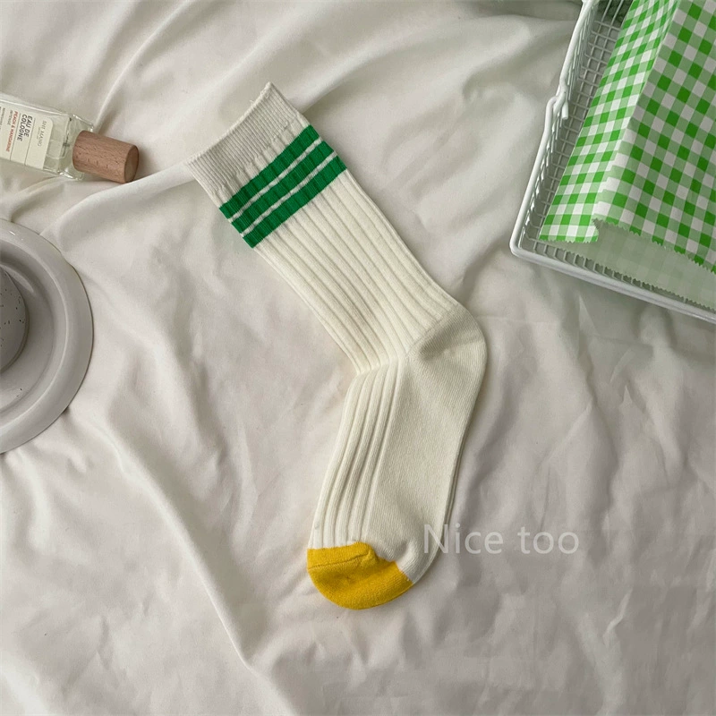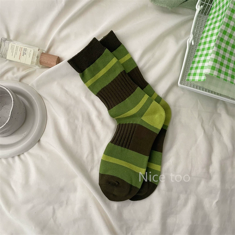 Socks for women spring and summer ins trendy green color contrast striped stockings simple and versatile Japanese style pile socks for women