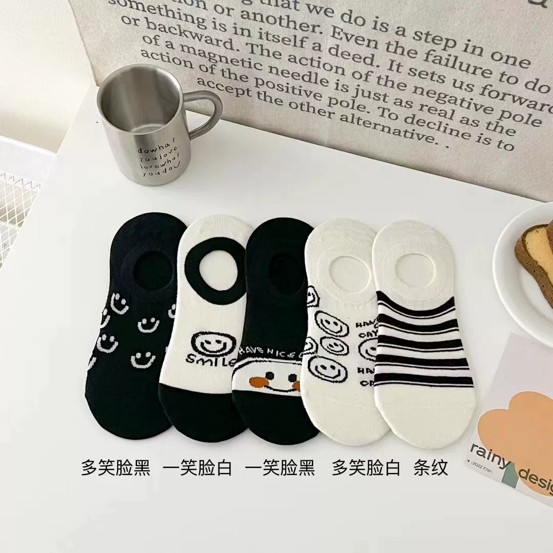 | nameOriginal | Socks for women summer style ins fashion versatile Korean boat socks invisible shallow mouth Japanese style cute smile stripes black and white. |