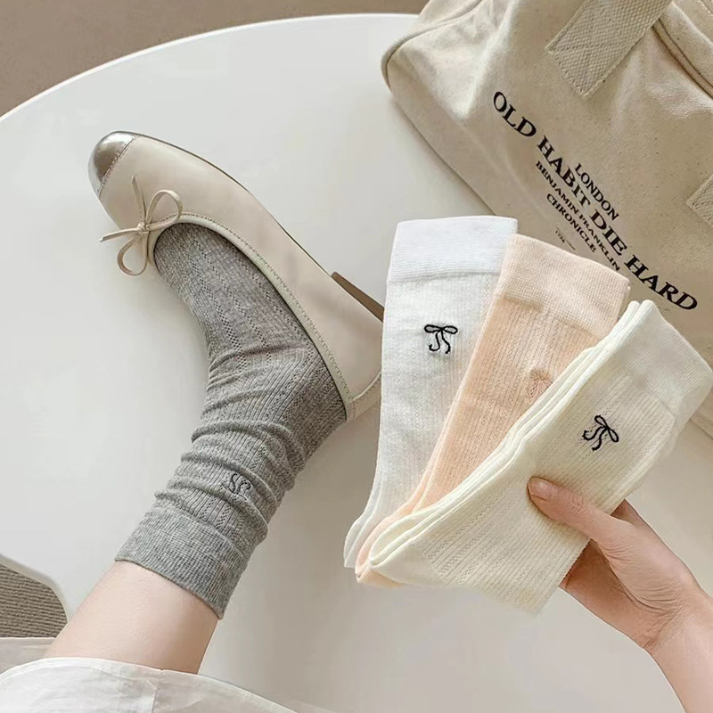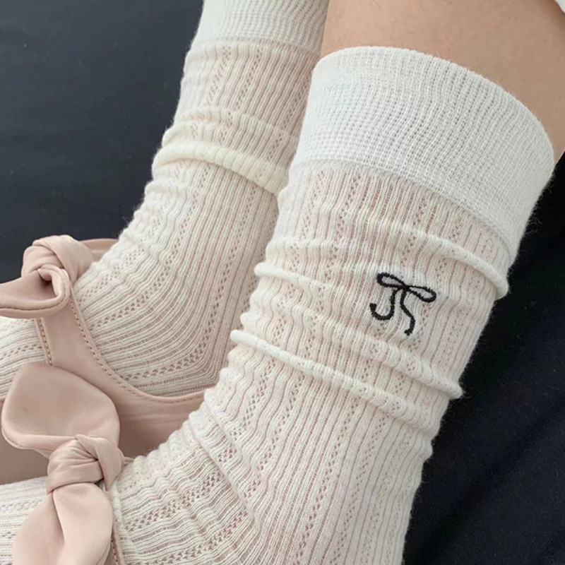 Socks Women’s Mid-tube Socks Summer Embroidered Bow Solid Color Women’s Stack Socks Breathable Thin Summer Ice Silk Stockings