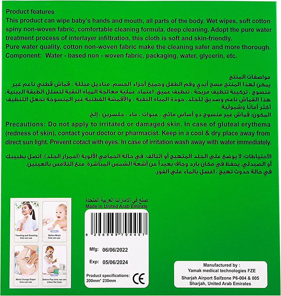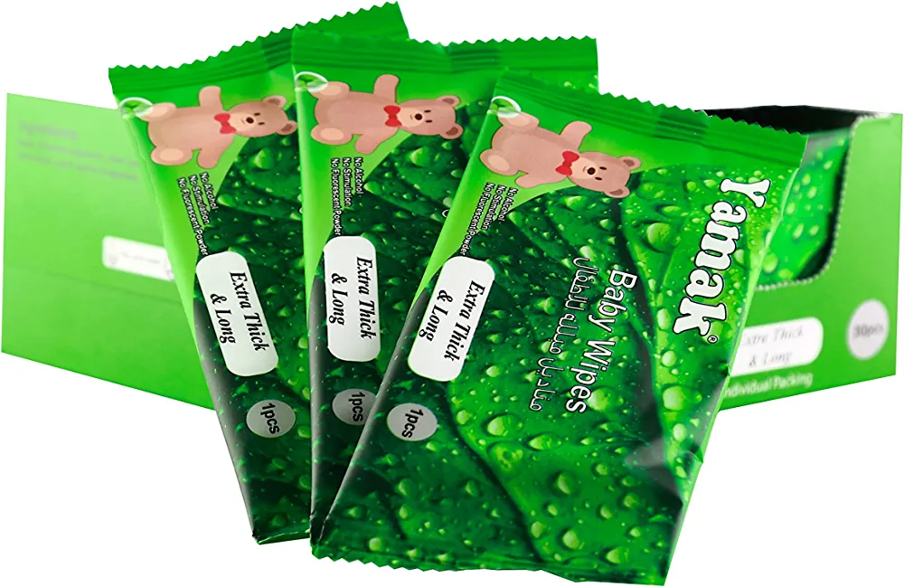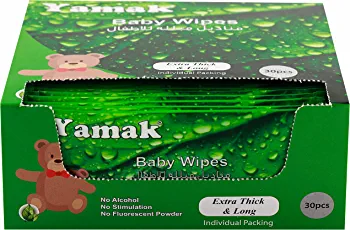 | descriptionOriginal | Yamak Wet Wipes for Babies, Premium Quality Pack of 30, Thick and Long, Travel Friendly with no added alcohol, Multi-purpose Whole Body Wipes Wet wipes are one of the most required skin care products with babies. It is used for wiping various parts of their body to make cleaning more convenient, easy and safe. Keeping this in view, we present to you Yamak Wet Wipes for Babies, a premium quality product to ensure utmost care and cleanliness for your little ones. These multi-purpose wipes will let your baby experience a boost of refreshing energy. This pack of 30 individually wrapped wipes is suitable for hands, mouth, face and any part of the body. We have used soft, cotton, spiny, non-woven fabric to make it skin friendly for children. The key ingredients used to make the wet wipes are all natural and contain no alcohol, stimulants or fluorescent powder. So, add this essential to all your kids bags and travel bags and enjoy a splash of freshness every time you use it. The natural formula gives your baby a fresh feeling instantly. Yamak presents a pack of 30 individually wrapped premium quality wet wipes especially designed for Babies. No alcohol, no stimulation and no fluorescent powder formula. |