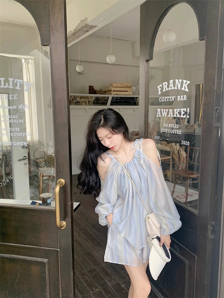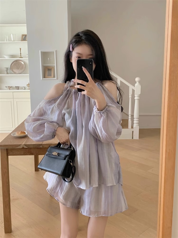 Soft and Lazy Style Thin Loose Sunscreen suit Women's Summer Long-sleeved Off-shoulder Shirt High Waist Wide-leg Shorts Two-piece Set