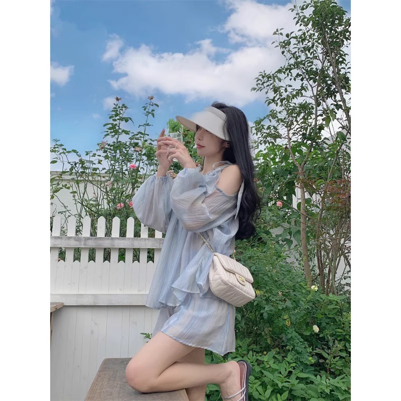 Soft and Lazy Style Thin Loose Sunscreen suit Women’s Summer Long-sleeved Off-shoulder Shirt High Waist Wide-leg Shorts Two-piece Set