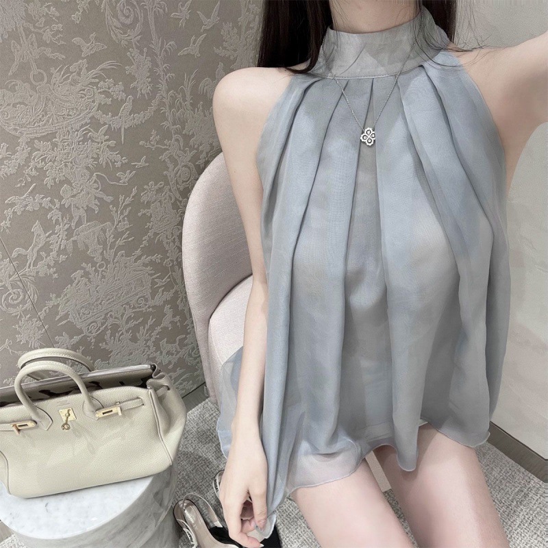 | nameOriginal | Solid Color Hanging Thin Chiffon Shirt Women's 2024 New Korean Style Niche Design Pleated Sleeveless Shoulder Top Trendy |