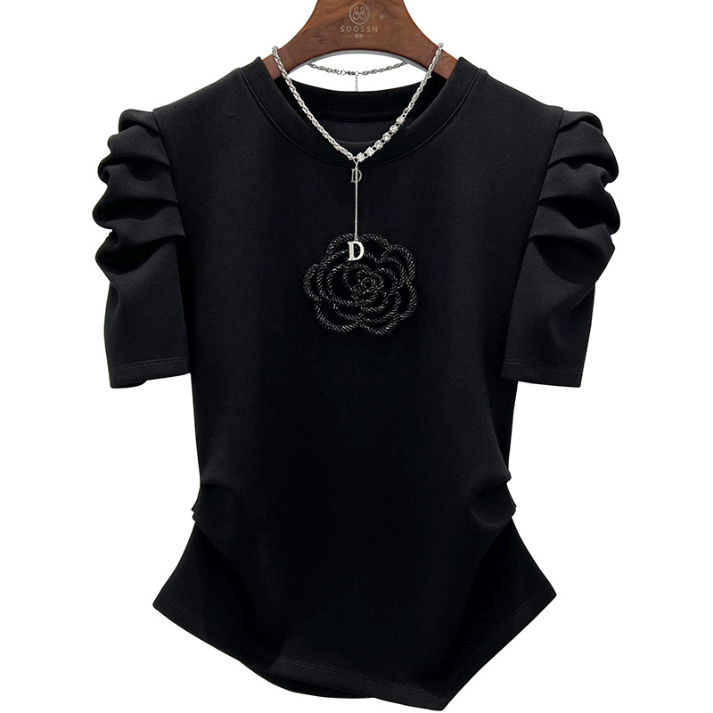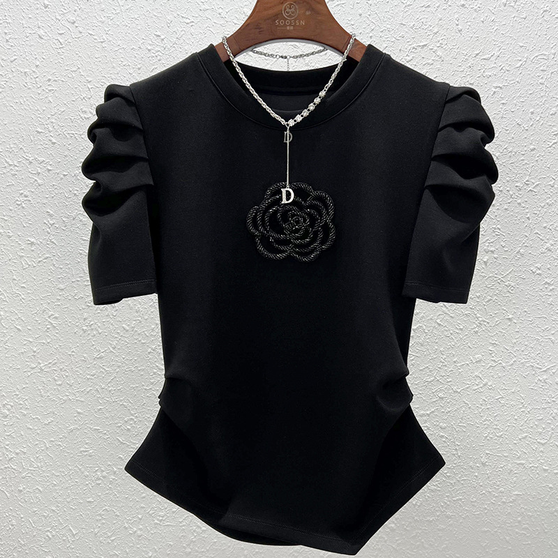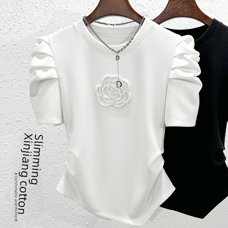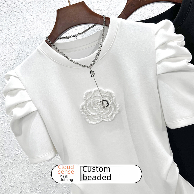 | nameOriginal | Solid Color Heavy Industry Beaded Three-dimensional Camellia Irregular Hem Short-sleeved T-shirt Summer Design Western Style Ins T-shirt |