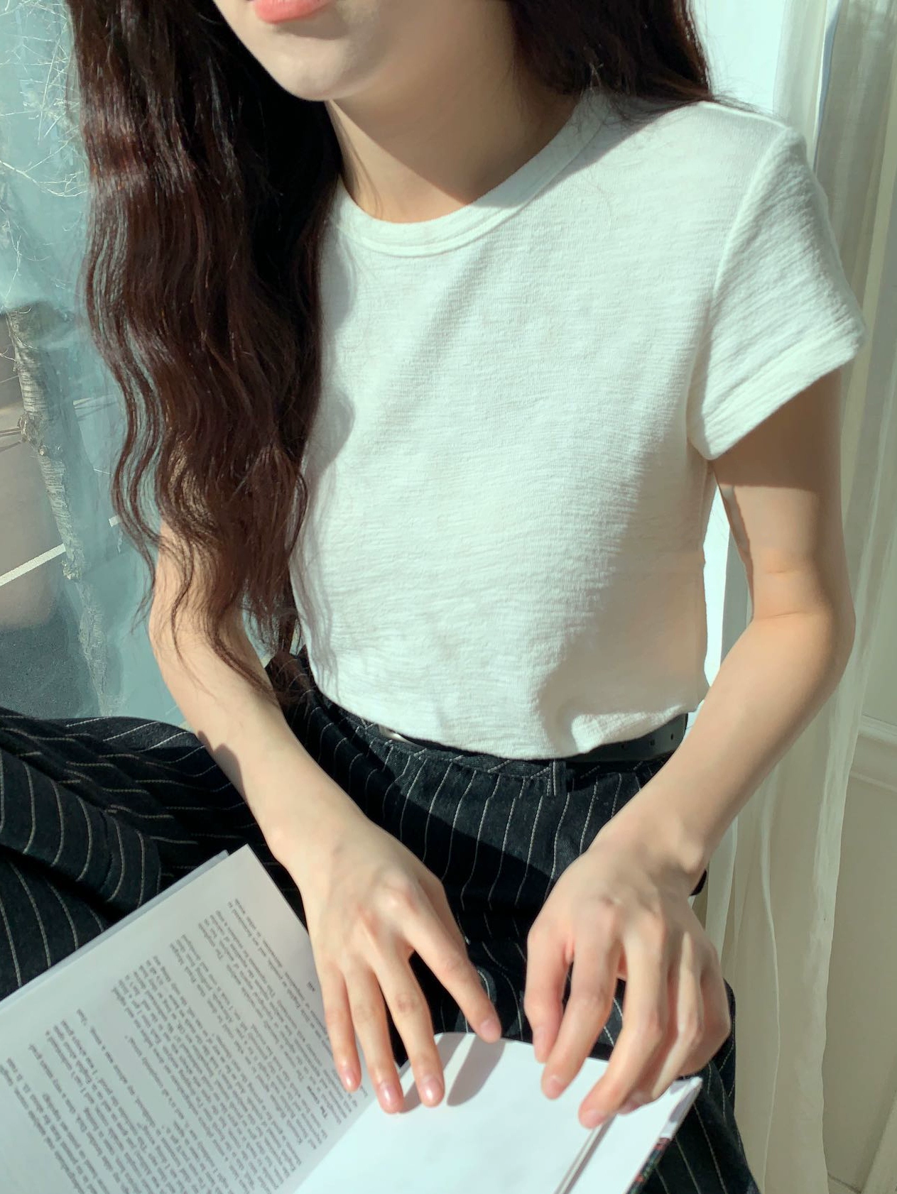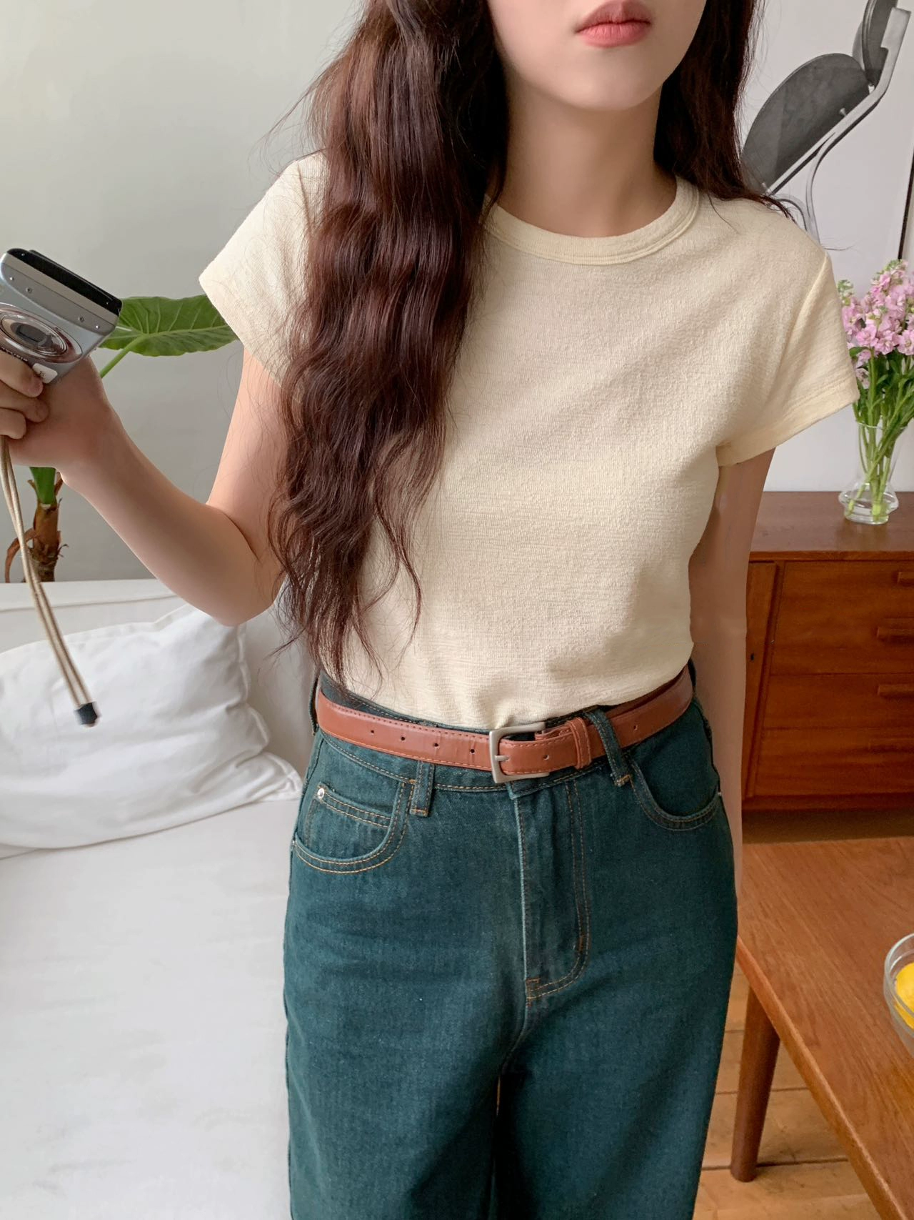 Pure -colored loose straight tube card waist round collar short -sleeved T -shirt