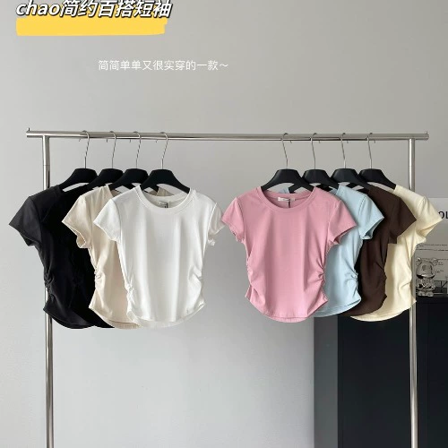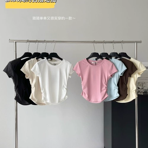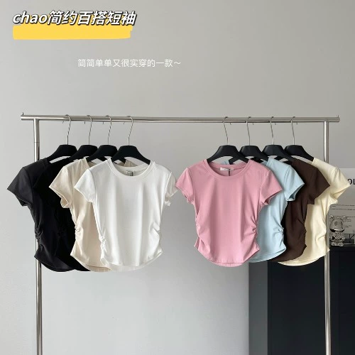 Solid color pleated irregular short-sleeved T-shirt for women 2024 spring new slim waist slimming round neck T-shirt top