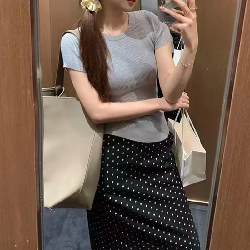 Solid Color Sweet and Spicy Shoulder Crewneck Knitted Short-sleeved Women's 2024 New Pure Desire Style Elegant Slim-fit Top T-shirt for Women
