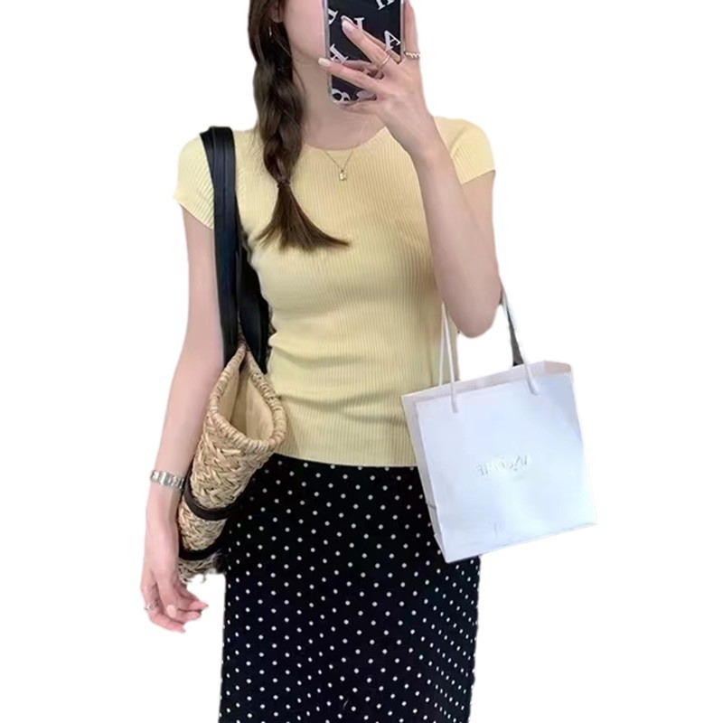 Solid Color Sweet and Spicy Shoulder Crewneck Knitted Short-sleeved Women’s 2024 New Pure Desire Style Elegant Slim-fit Top T-shirt for Women