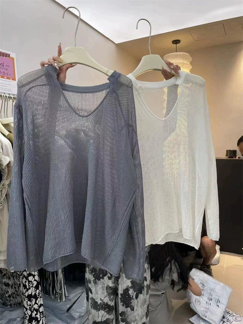 Solid color thin sun protection shirt for women Korean version 2024 summer new loose V-neck long-sleeved hollow air-quality knitted top