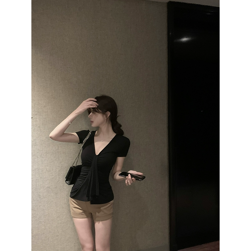 | nameOriginal | Solid Color V-Neck Right Shoulder Summer Waist Top Short Sleeve T-Shirt |