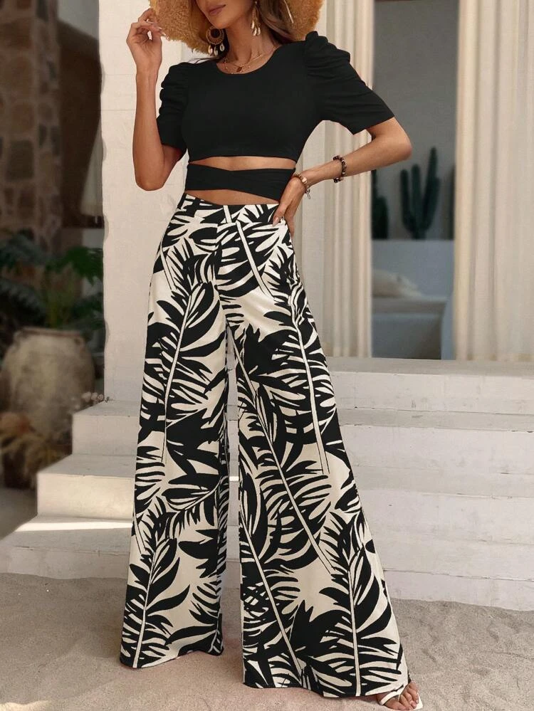The tropical print wide leg pants are the perfect complement to the crop tee. The pants are made of lightweight fabric that is perfect for summer. The tropical print adds a touch of fun and excitement to the outfit, making it perfect for a day out with friends or a casual date. The wide leg design provides a comfortable and relaxed fit, while the high waist design adds a touch of elegance to the outfit.