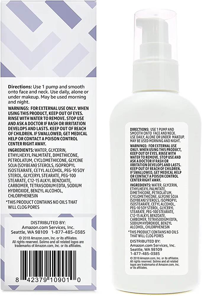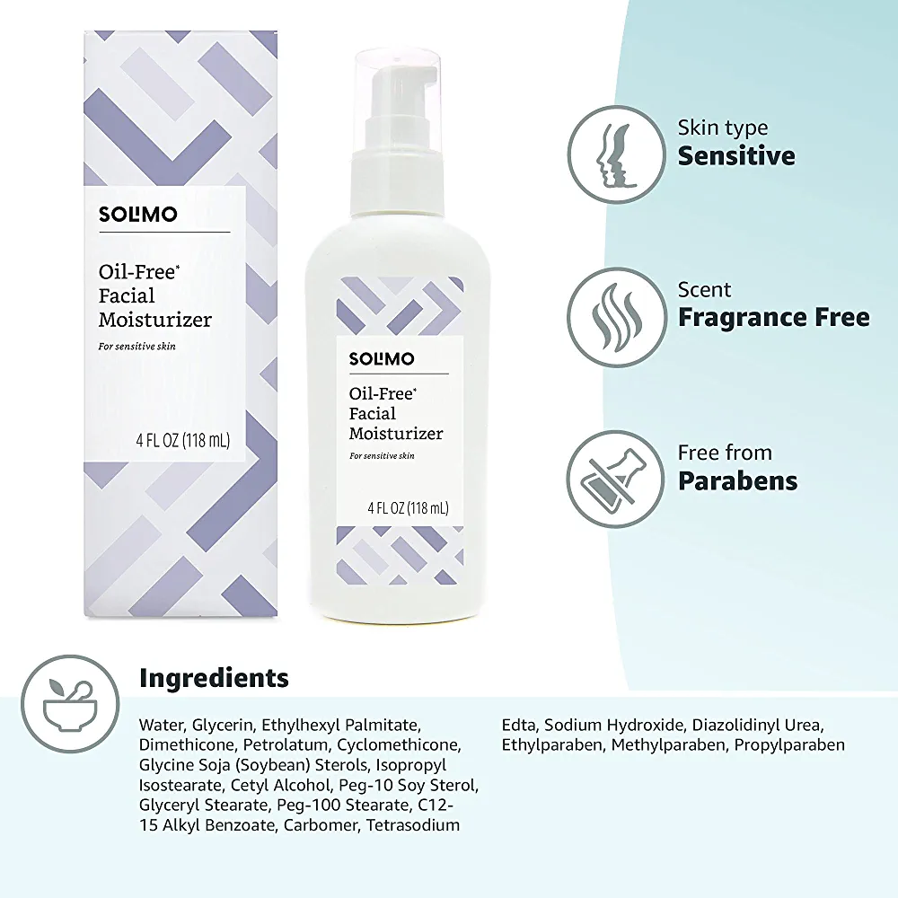 Solimo Oil-free Moisturizer for Sensitive Skin is a gentle face moisturizer that's fragrance free, alcohol free, paraben free and great for daily use.