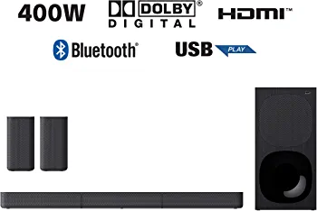 Transform your movie-watching experience with the HT-S20R sound system. This 5.1 channel sound system delivers real surround sound with its rear speakers and external subwoofer, working together with a 3ch sound bar to create a dynamic and cinematic sound. With a total power output of 400W, every scene comes to life with dramatic and high-quality surround sound from 5.1 separate audio channels with Dolby Digital technology.