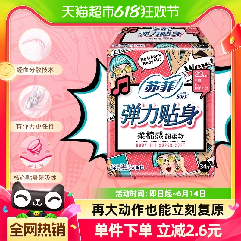 Sophie sanitary napkin, elastic, close-fitting, soft cotton feel, slim daily use sanitary napkin, wing-shaped 230mm*34 pieces