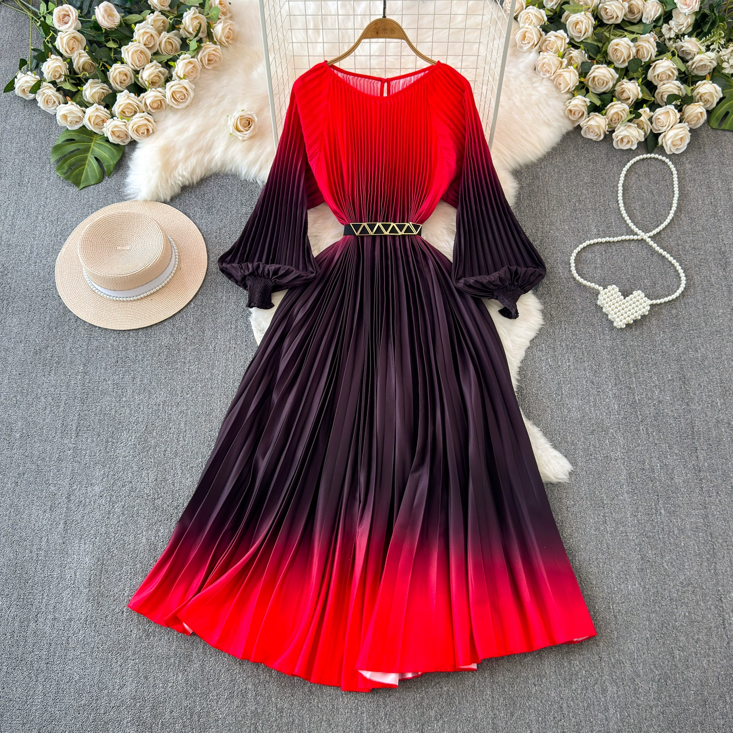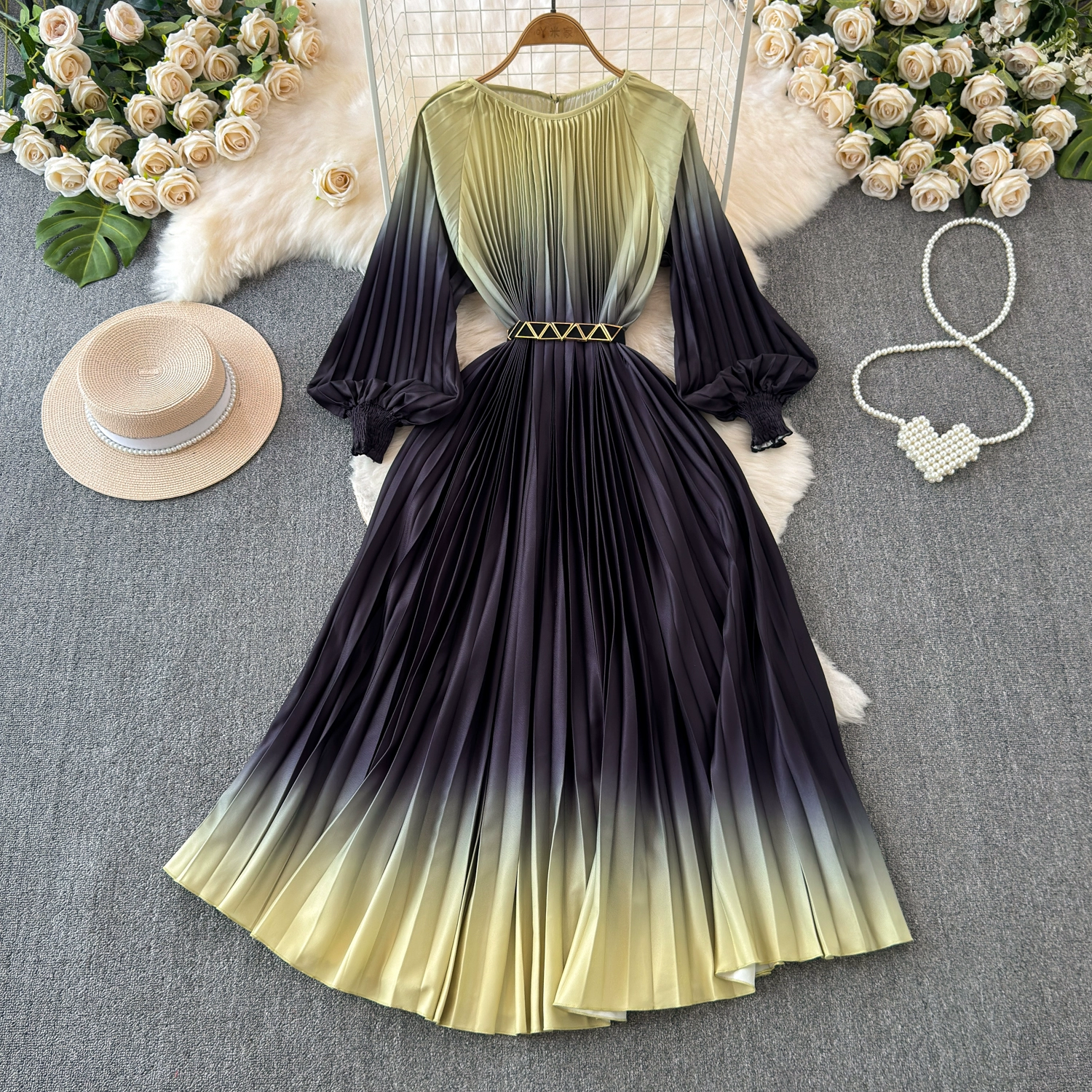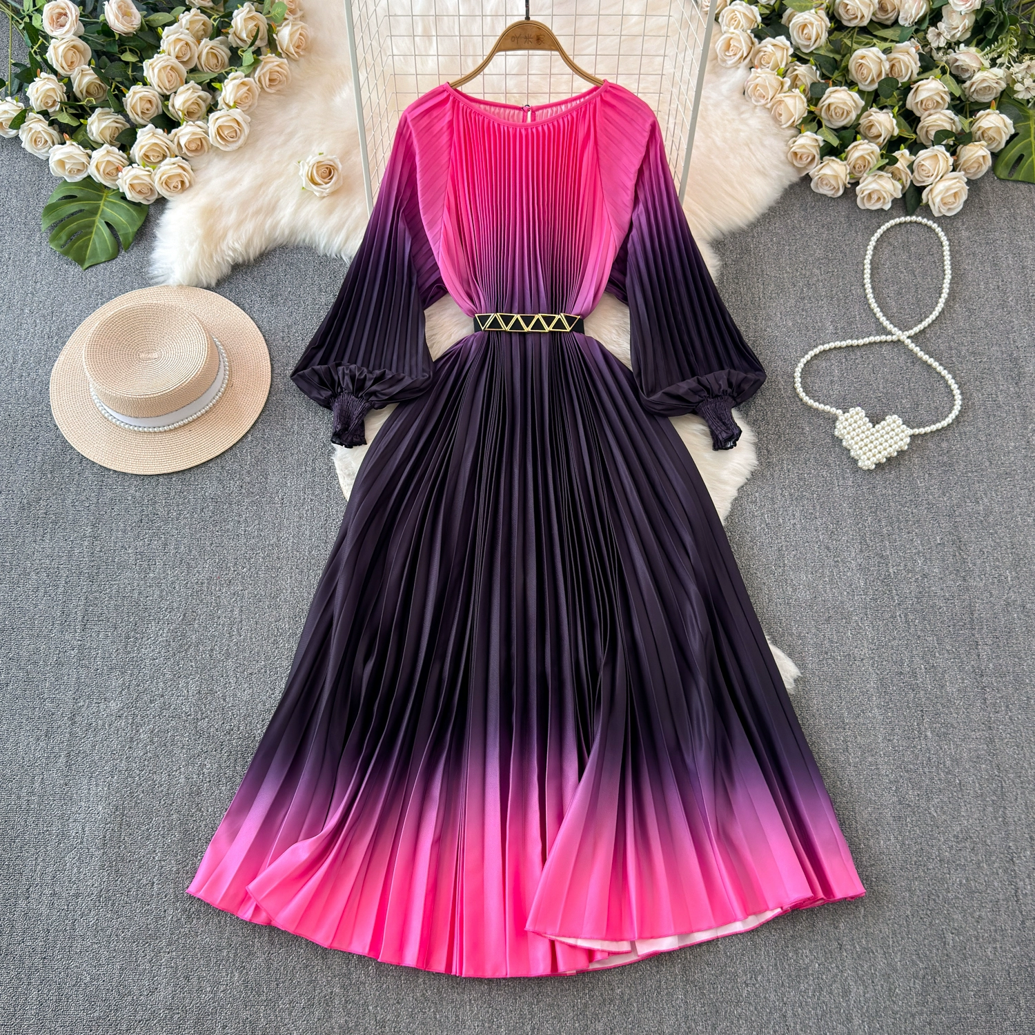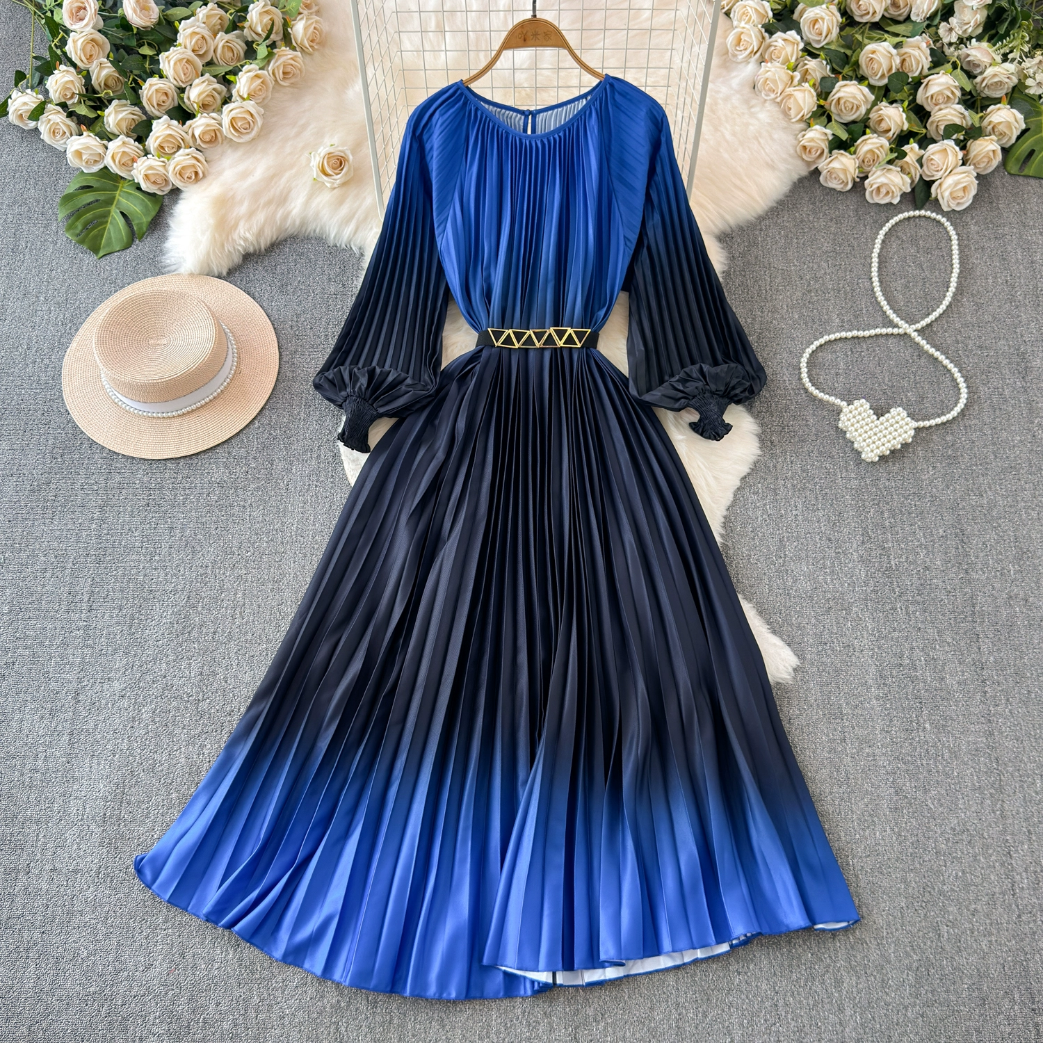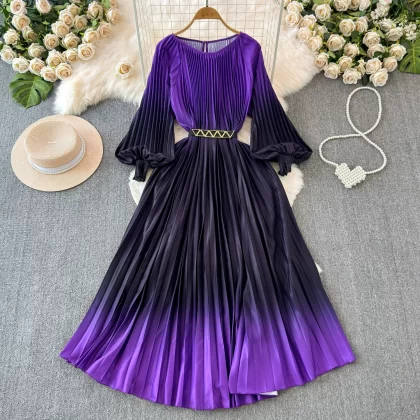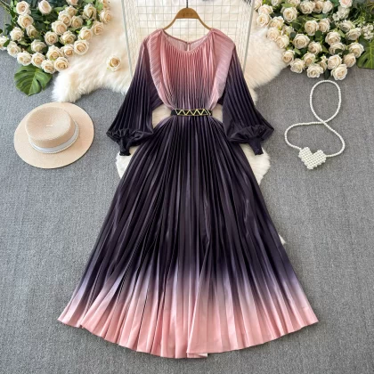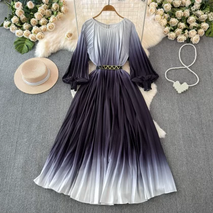 Sophisticated and ladylike long-sleeved round neck waist slimming large hem gradient printed pleated A-line dress