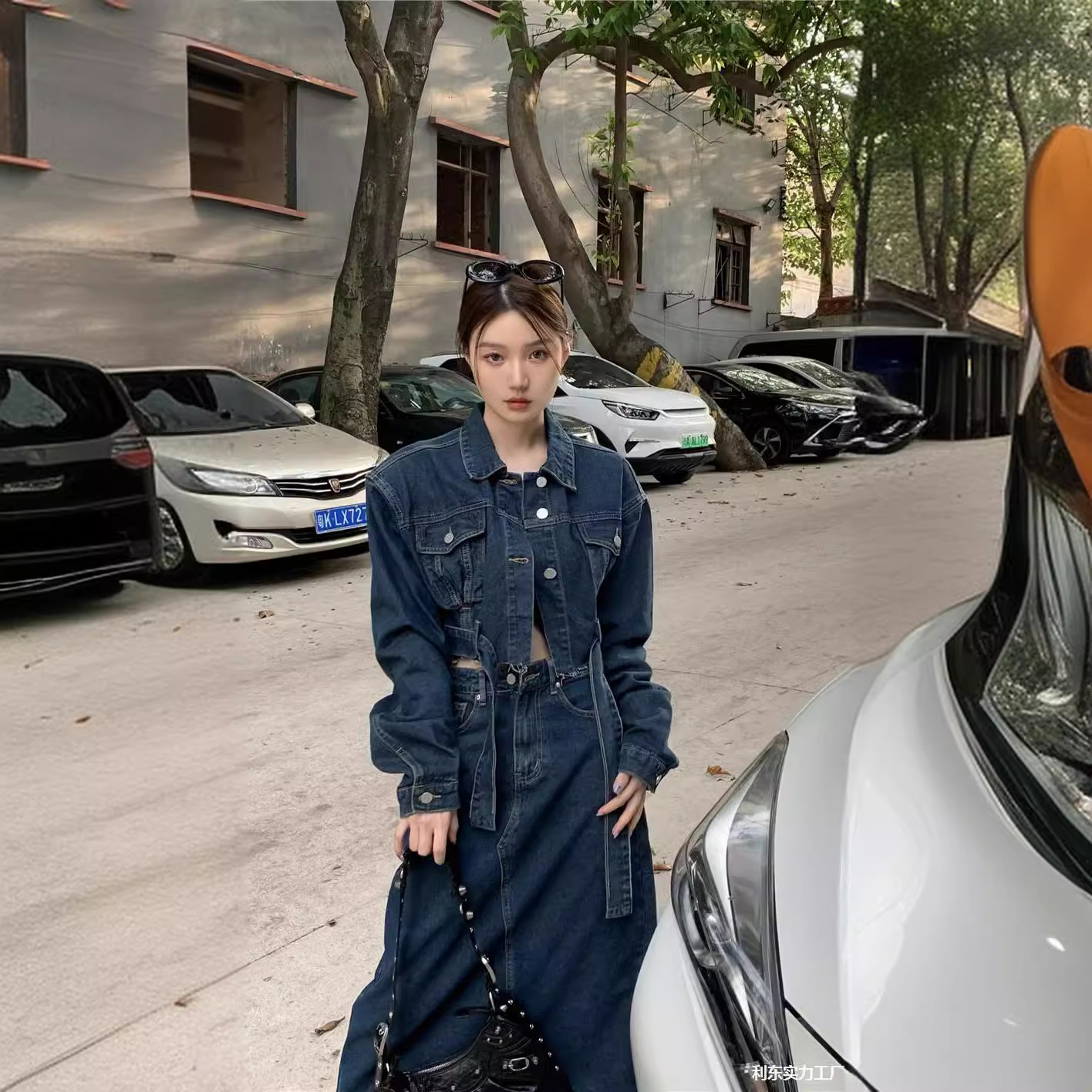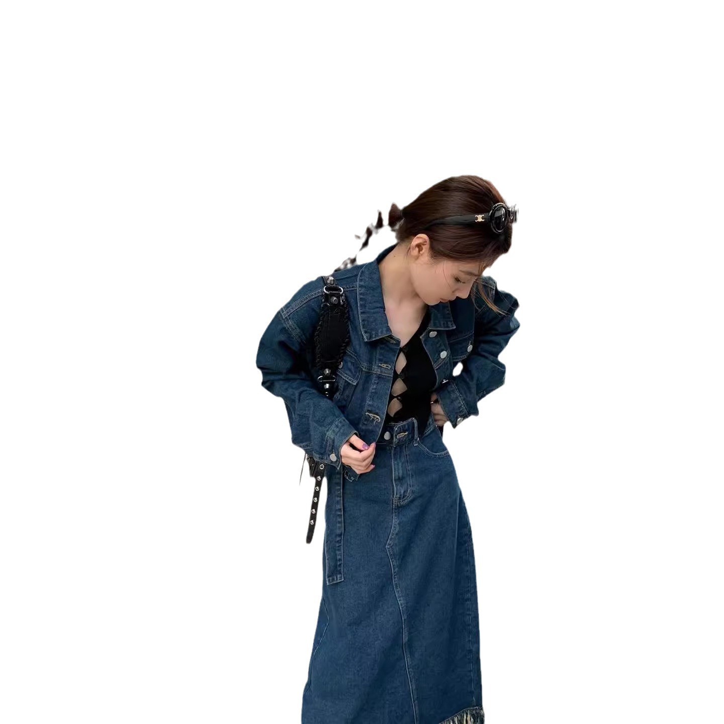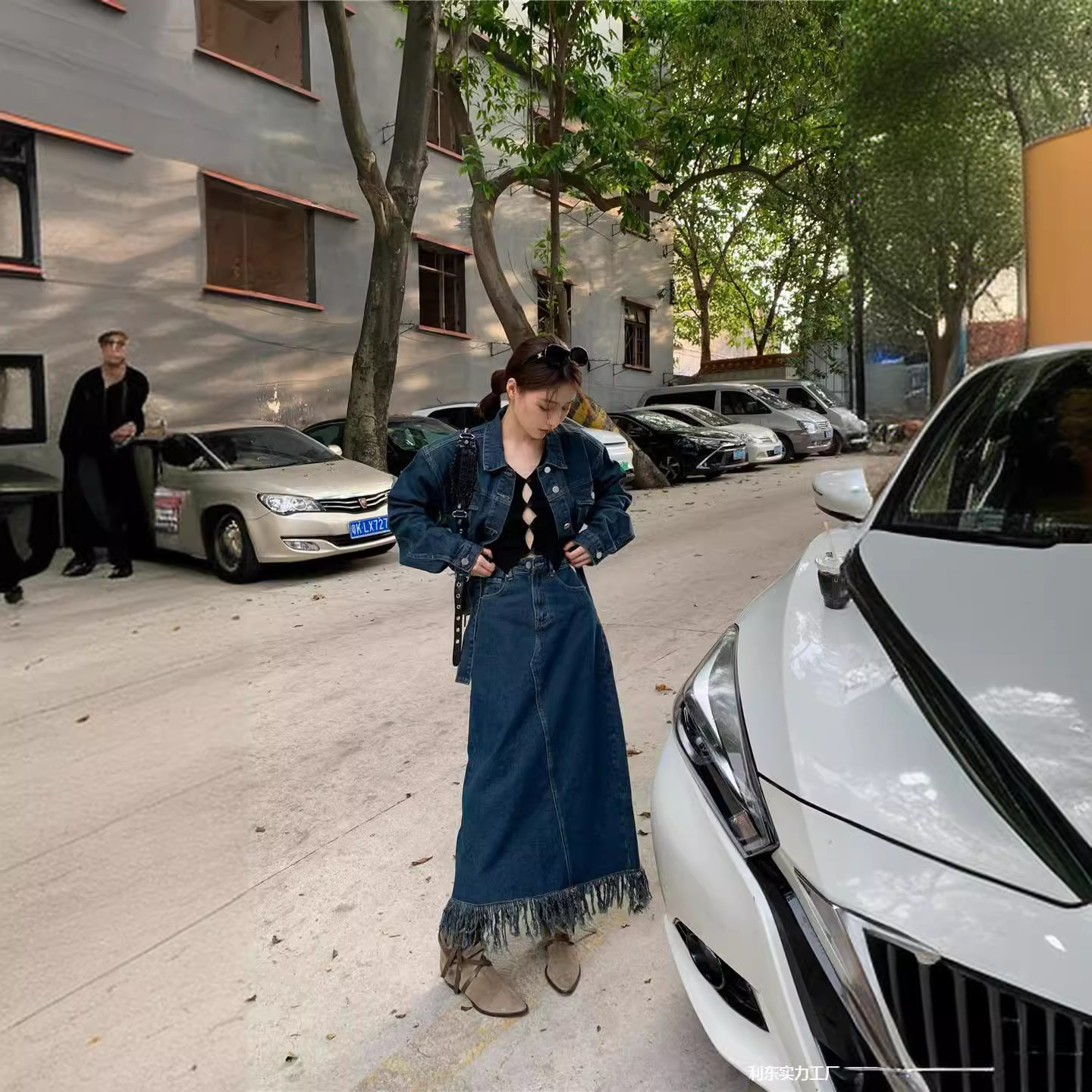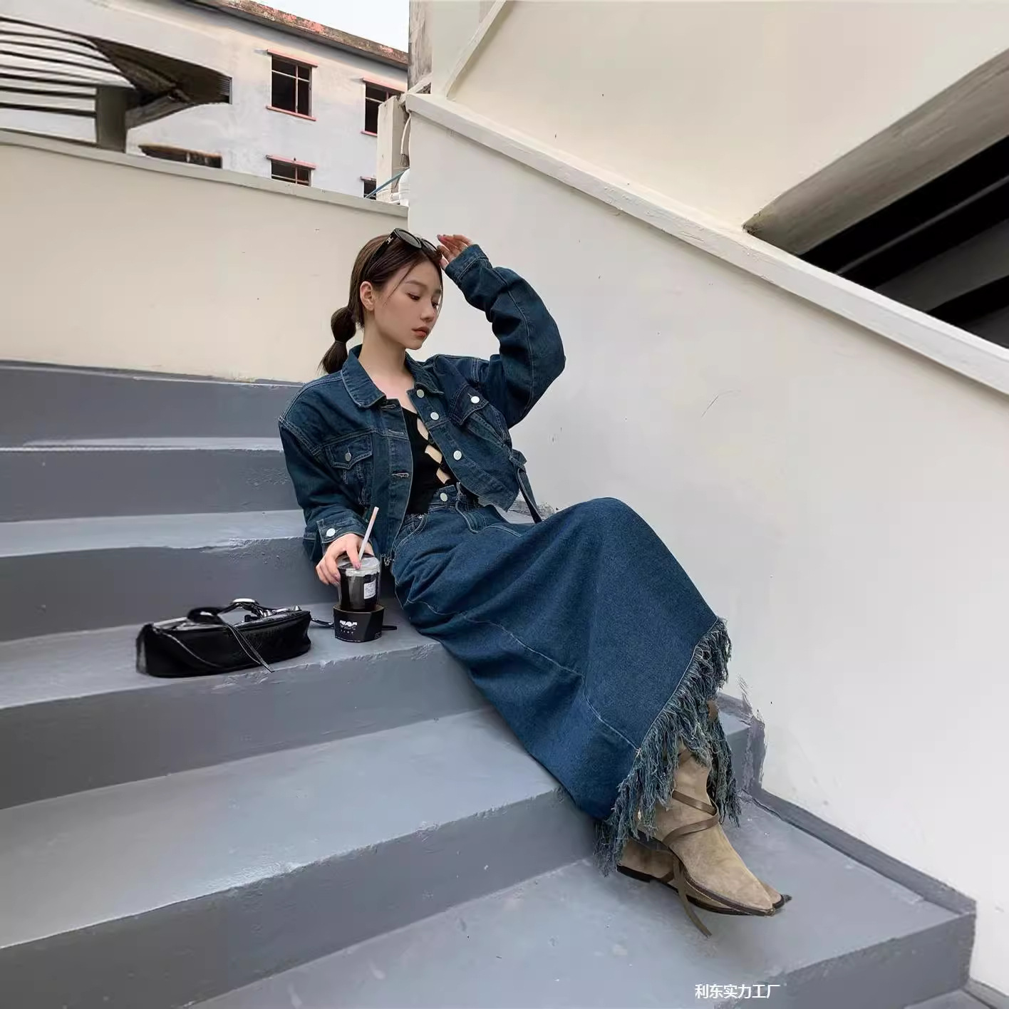 Source Factory All-match Design Sense Loose Long Sleeve Denim Jacket Tassel Skirt