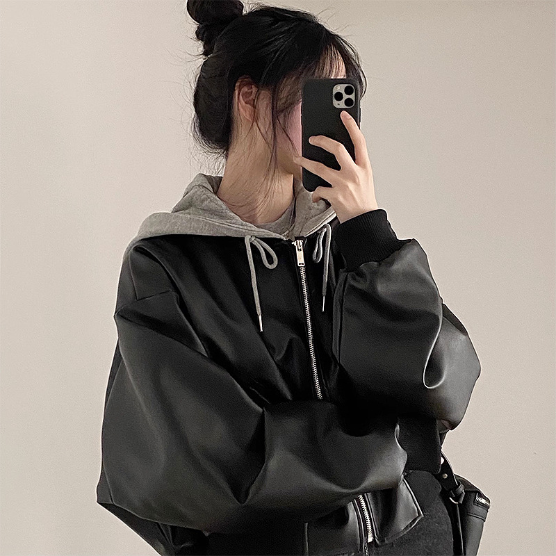 South Korea chic autumn and winter niche retro zipper double pocket casual loose all-match fake two-piece hooded leather coat