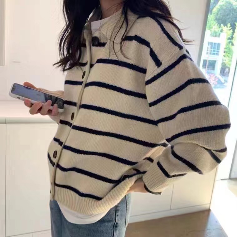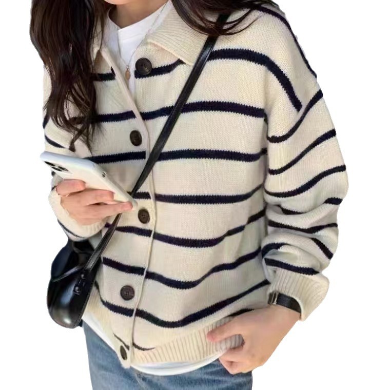 | nameOriginal | South Korea Chic Autumn and Winter Retro Western-style Lapel Single-breasted Casual Loose All-match Striped Knitted Cardigan Sweater for Women |