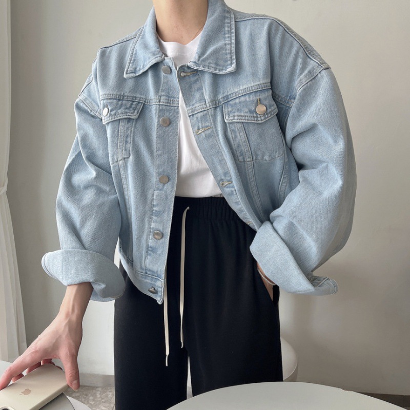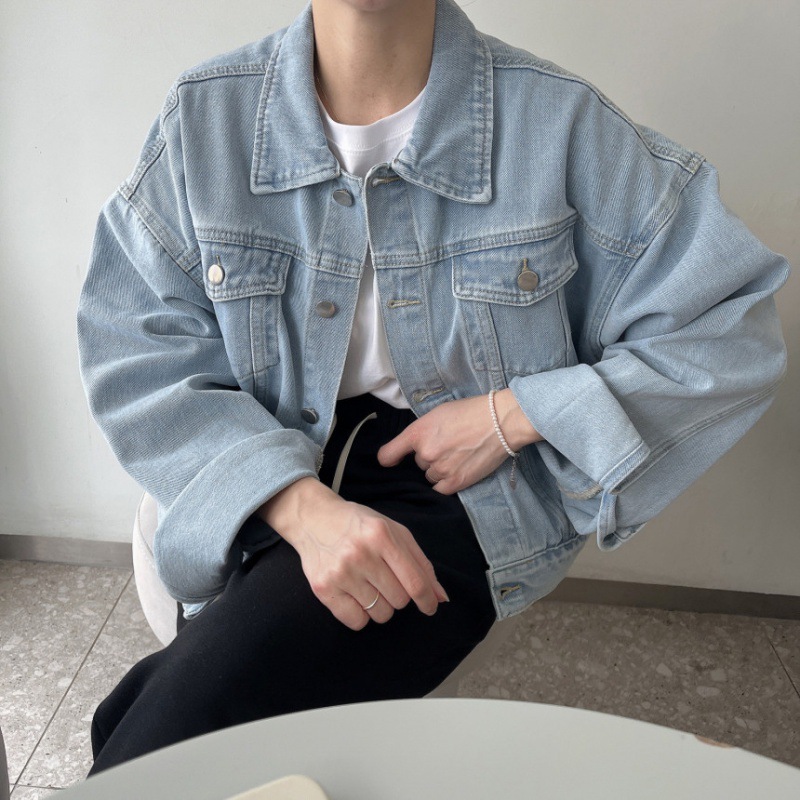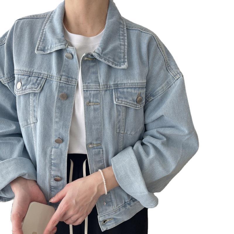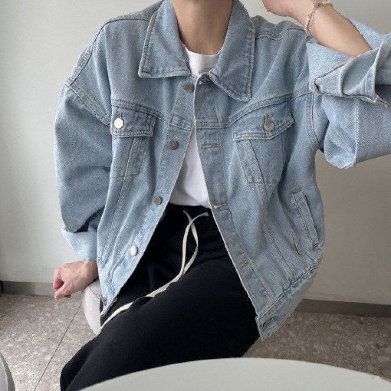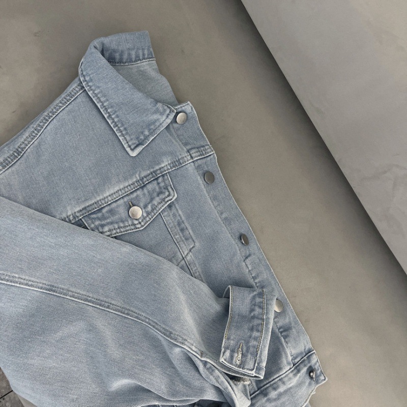 South Korea chic spring and autumn simple double pocket lapel open line loose versatile slimming washed blue Denim coat for women