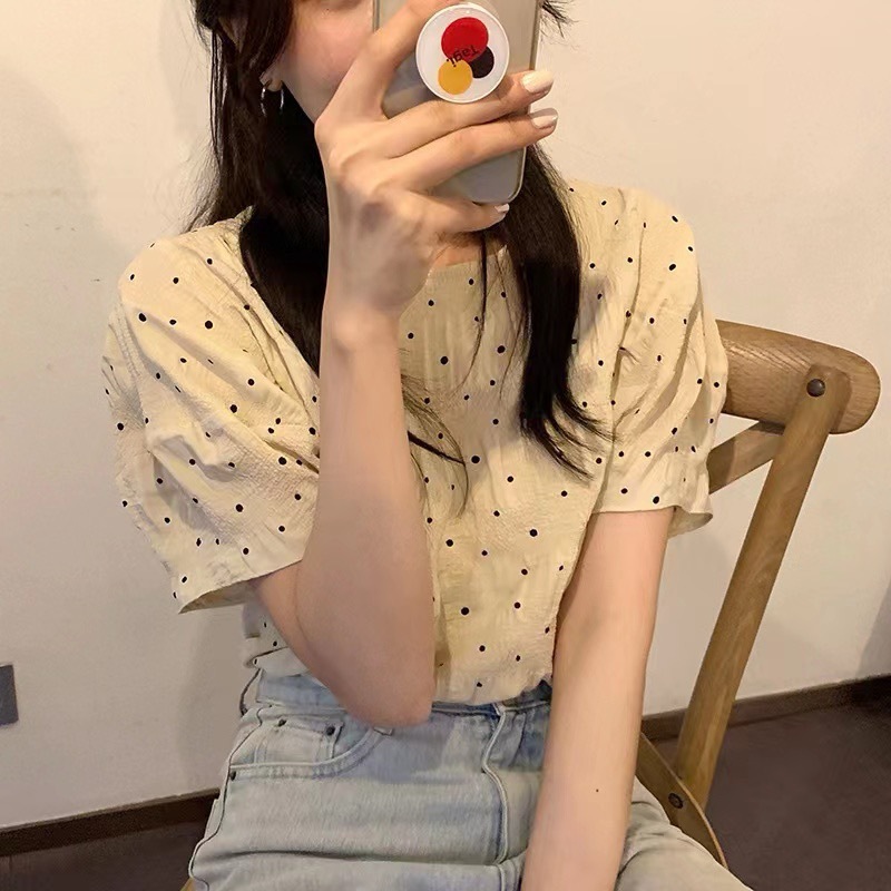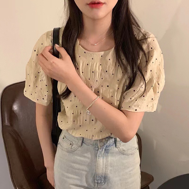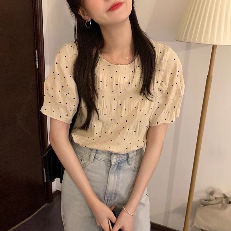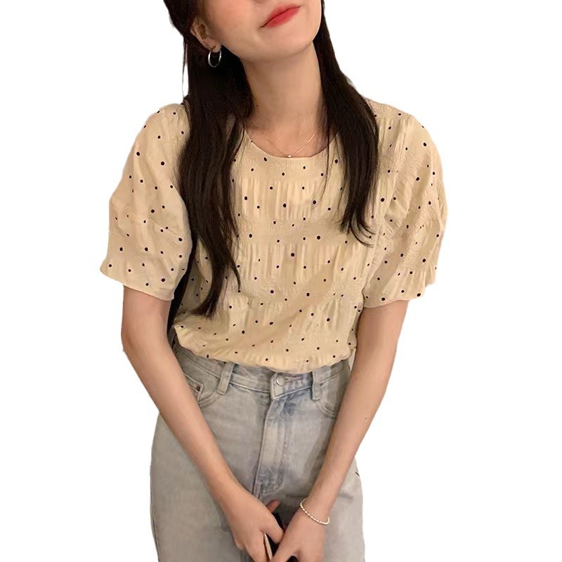 | nameOriginal | South Korea Chic Summer Vintage Simple Age-reducing Polka Dot Fresh Round Neck Pleated Loose Short-sleeved Shirt Top for Women |