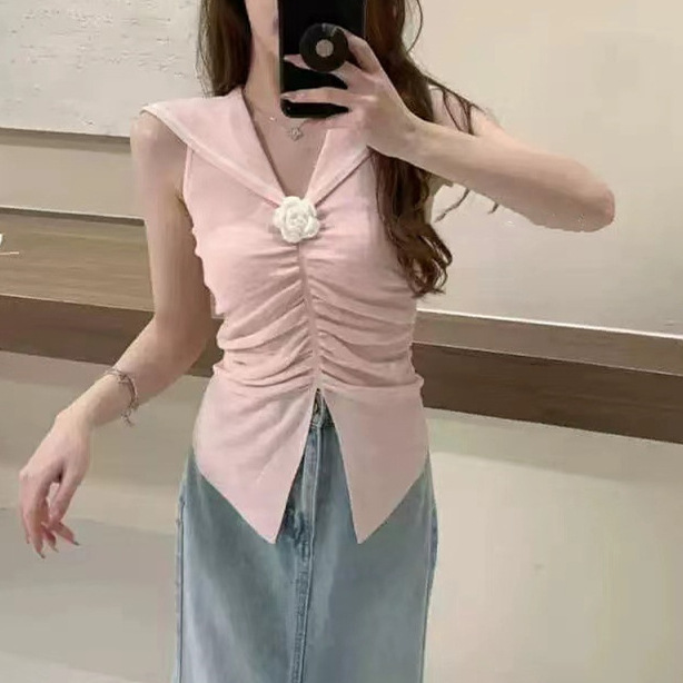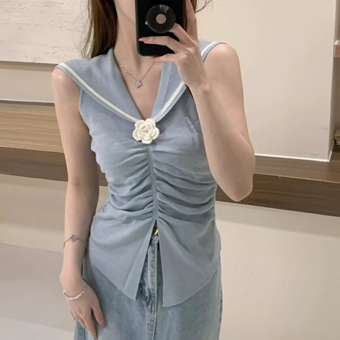South Korea Dongdaemun 2024 Summer New Korean Style Slim-fit Navy Lel Handmade Flower Pullover Knitted Vest