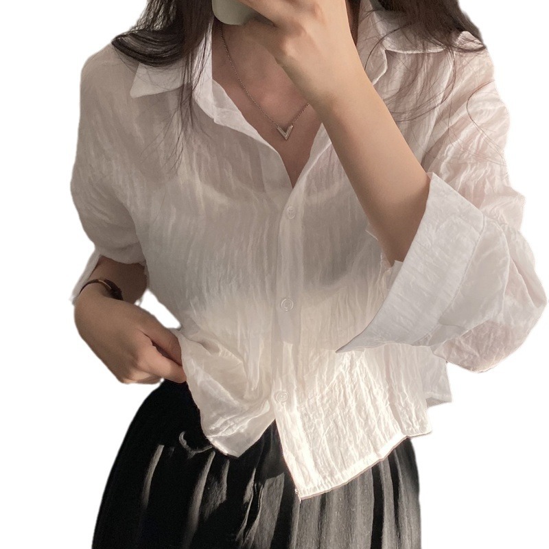South Korea ins early autumn ice cream color wrinkle long sleeve shirt loose sun protection shirt for women