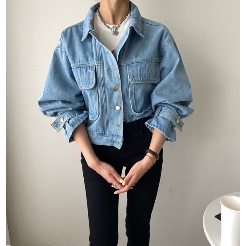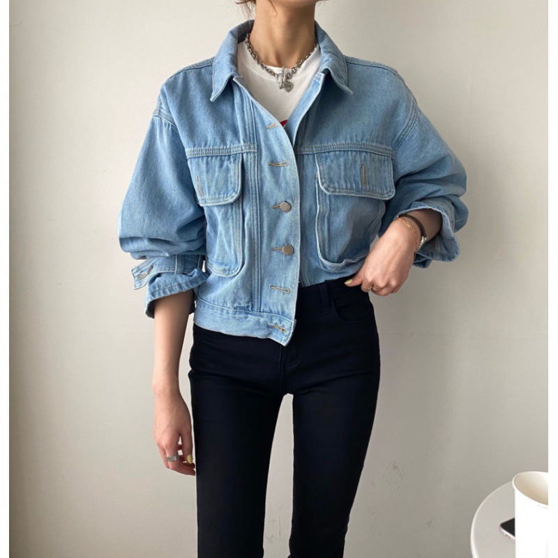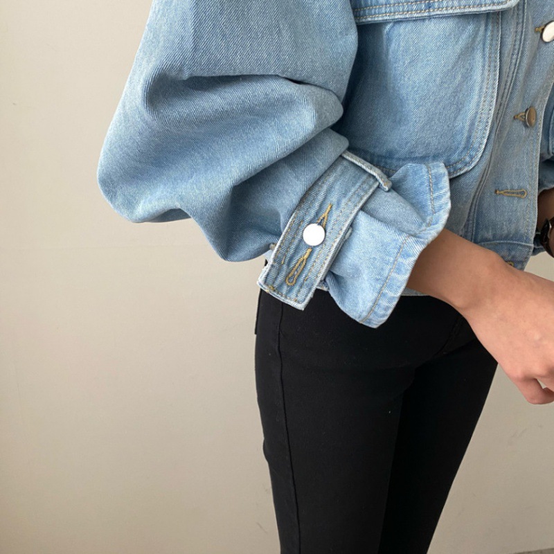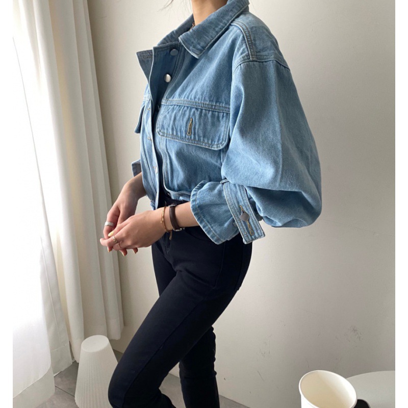 | nameOriginal | South Korea spring and autumn niche retro lapel single-breasted loose short pocket lantern sleeve washed blue Denim coat for women |