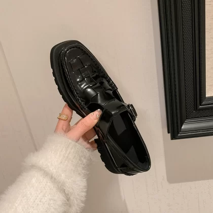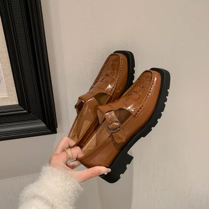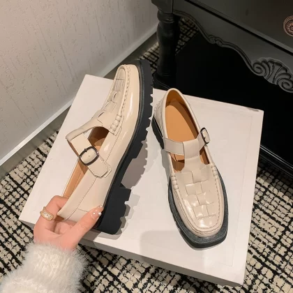 | nameOriginal | Spanish niche H family retro woven thick-soled loafers for women square toe genuine leather T-strap small leather shoes thick heel single shoes |