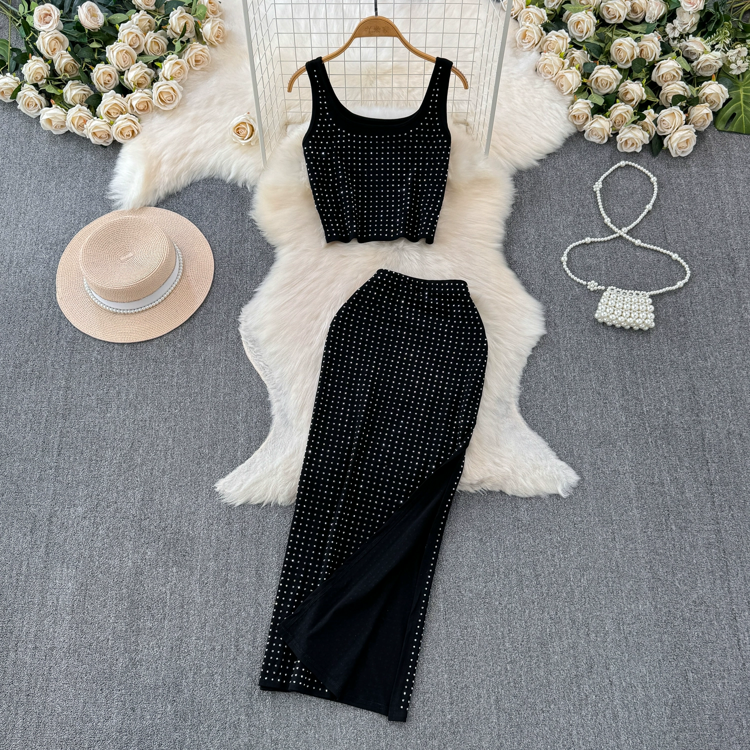 | nameOriginal | Sparkling hot diamond vest suit skirt high waist slim sexy hip-covering slit mid-length skirt two-piece suit summer |