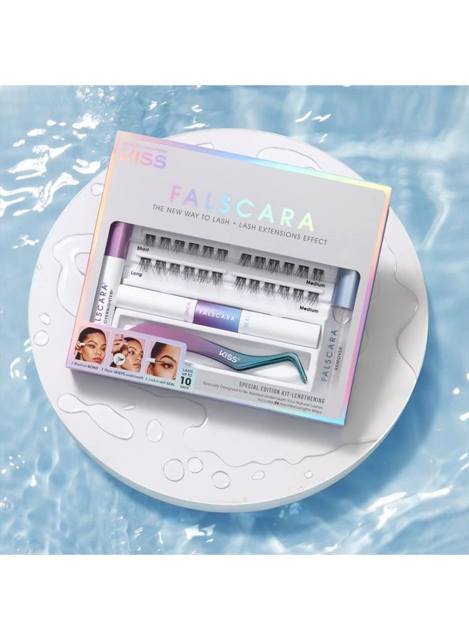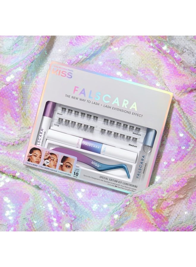 The KISS Falscara Special Edition Starter Kit provides everything you need to achieve the look of lash extensions, including a multipack of wisps and an Overnighter option for extended wear of up to 10 days. Unlike traditional false lashes, Falscara wisps are placed underneath your natural lashes for a more natural appearance that can be built up for a glamorous look. The customizable shape and split lash tip make them incredibly comfortable to wear. The starter kit includes 24 assorted length wisps, Overnighter long wear sealer, Bond & Seal to prep lashes and hold wisps, and an applicator & remover. KISS is committed to providing high-quality, safe cosmetics to make every day more beautiful for everyone.