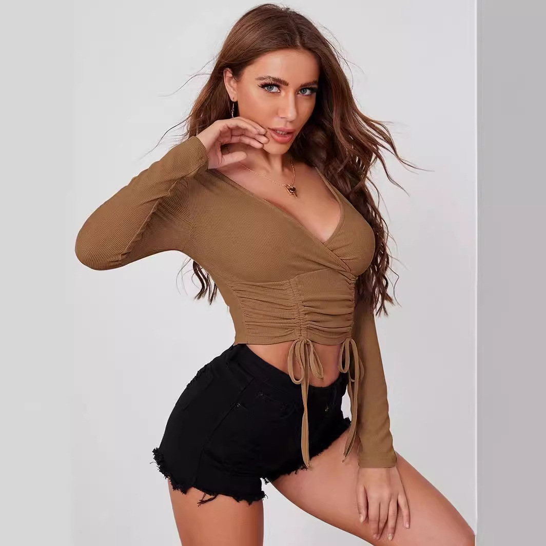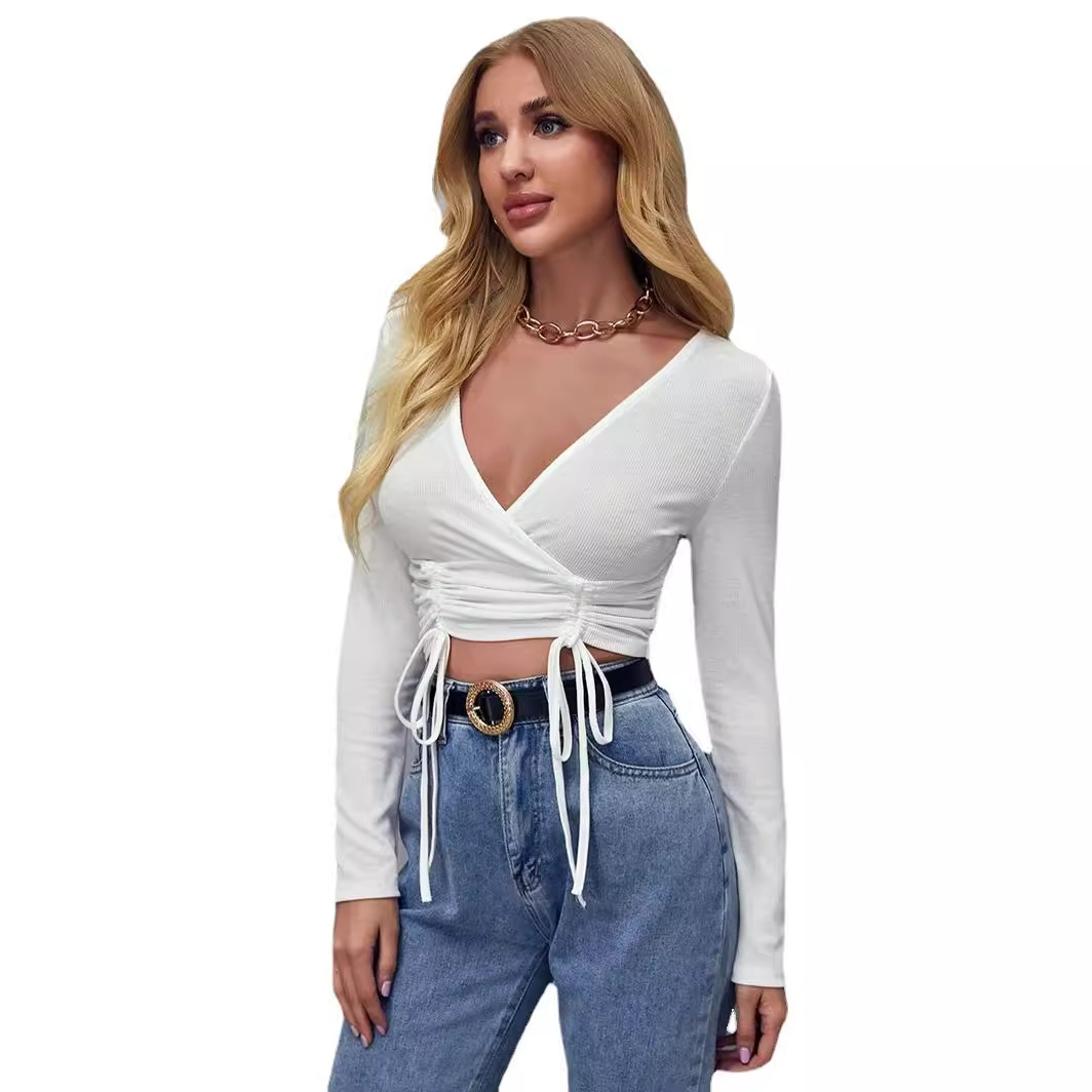 Special offer one-piece delivery Amazon cross-border top V-neck long sleeve solid color drawstring short temperament commuter women’s T-shirt