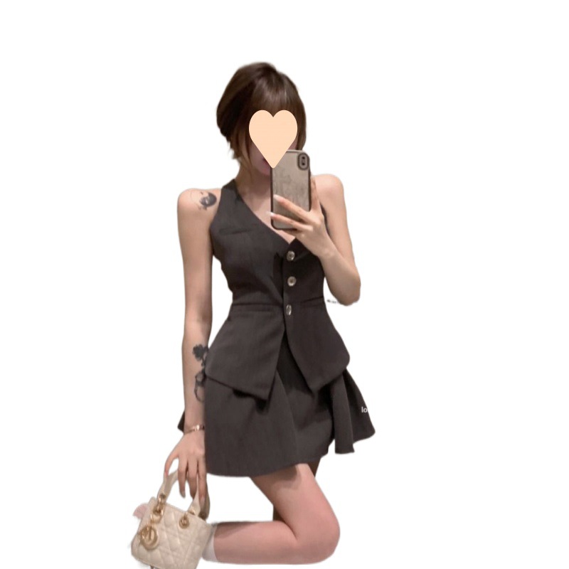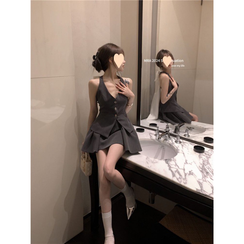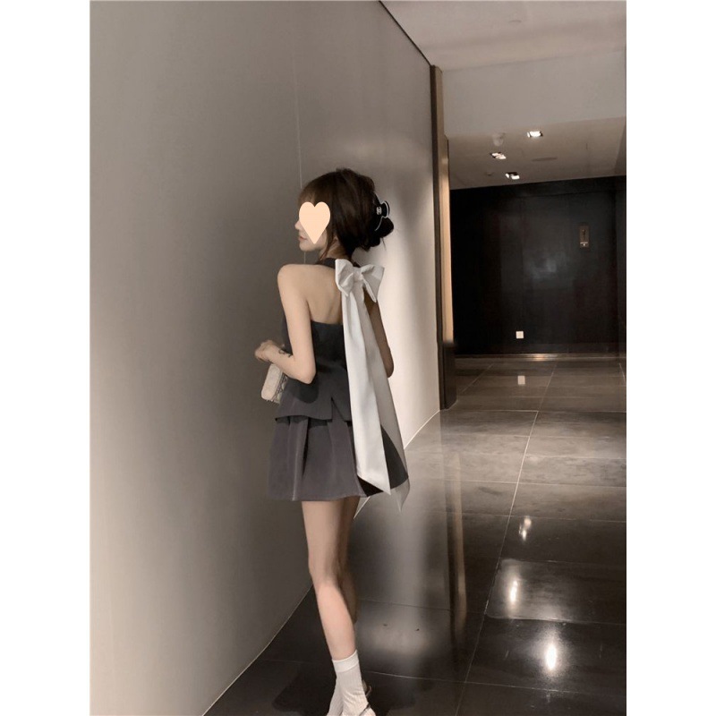 | nameOriginal | Spice Girl Style Bow Backless Neck Vest Top Elegant High Waist Slimming Pleated Skirt Summer Two-piece Set |