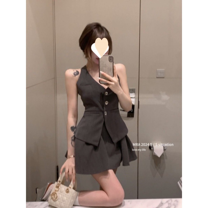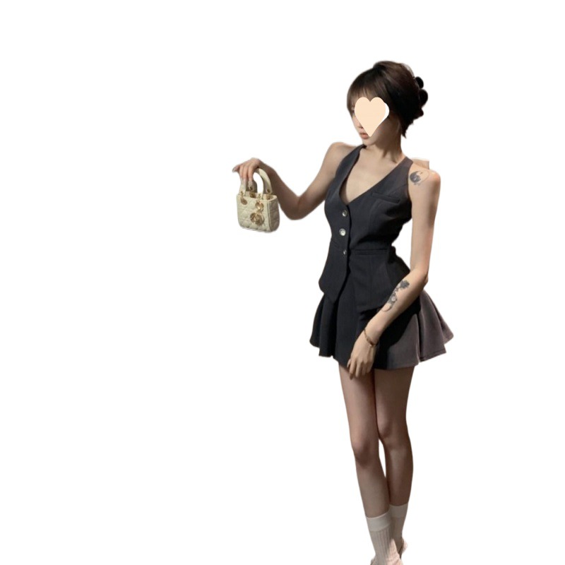 | nameOriginal | Spice Girl Style Bow Backless Neck Vest Top Elegant High Waist Slimming Pleated Skirt Summer Two-piece Set |