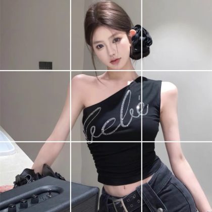 | nameOriginal | Spice Girls Slant Shoulder Letter Rhinestone Black Sleeveless Camisole Women's Summer Outer Wear Slim-fit Short Top 5268 |