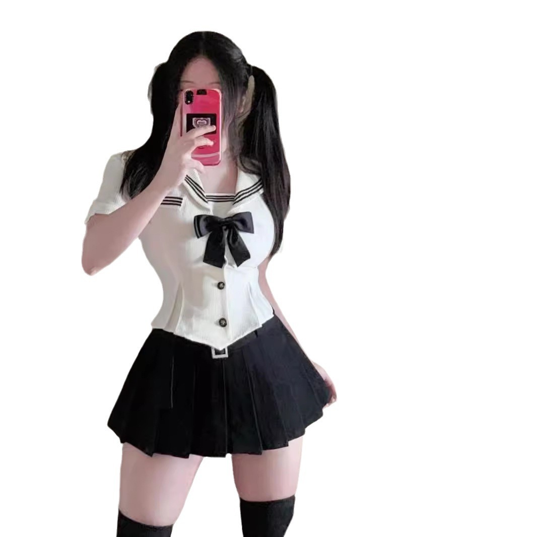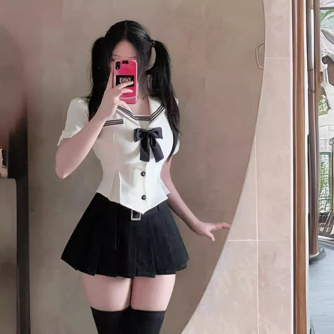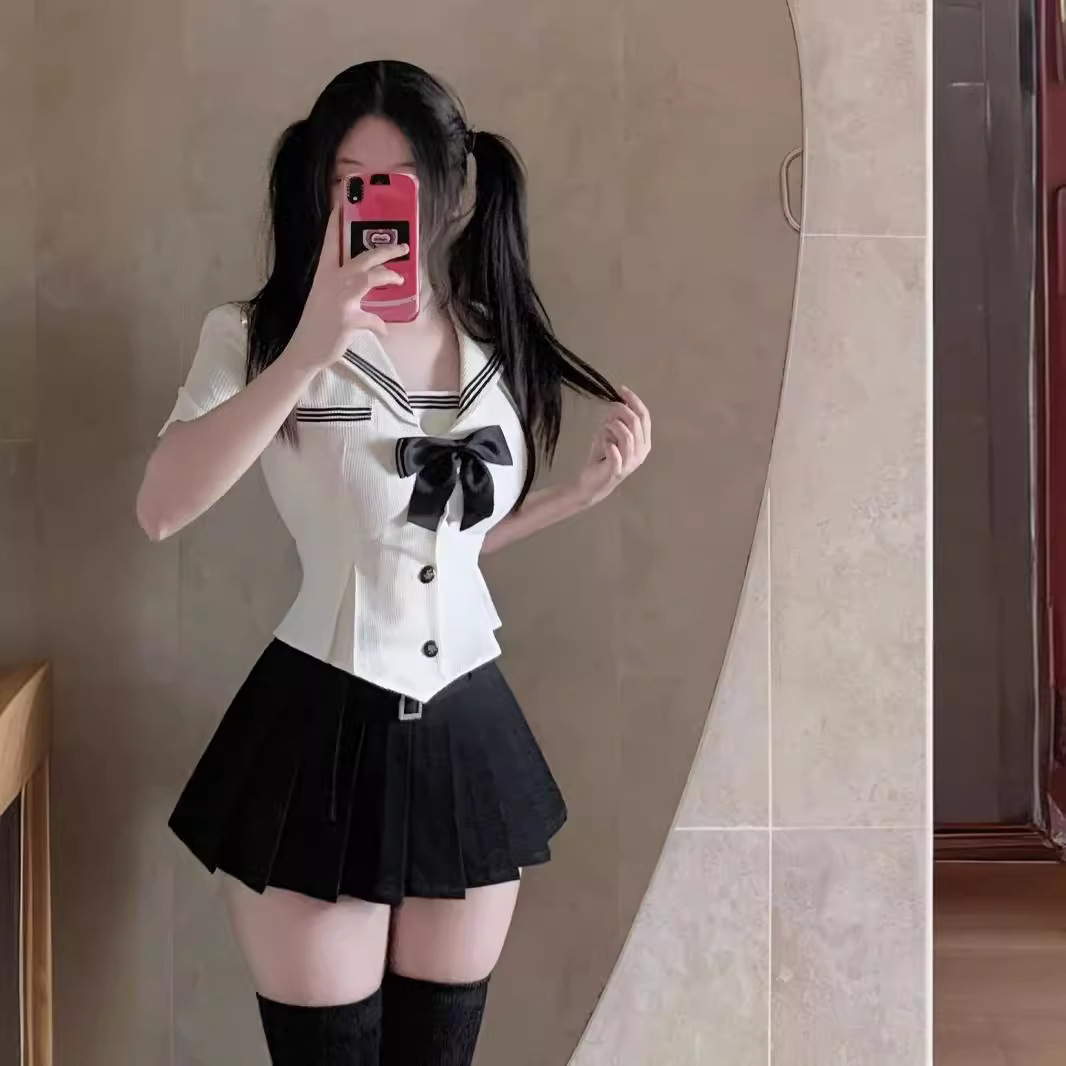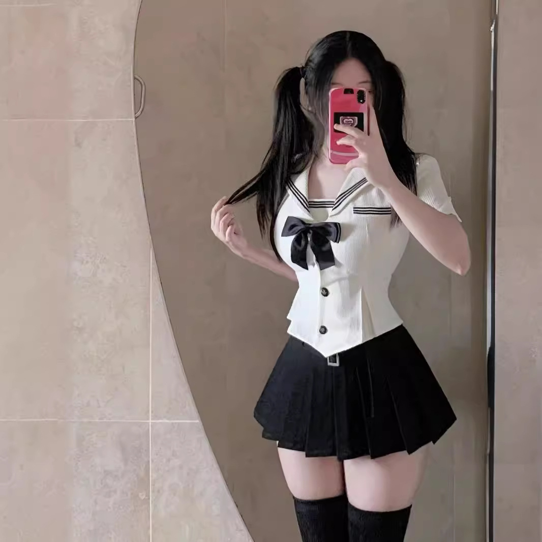 | nameOriginal | Spice Girls Vintage College Style JK Uniform suit Summer Pure Desire Navy Collar Tight Waist Short Sleeve Shirt High Waist Pleated Skirt |