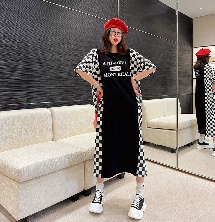 Spliced ​​checkerboard plaid large size short-sleeved T-shirt long skirt for fat women 300 pounds loose and sexy dress summer