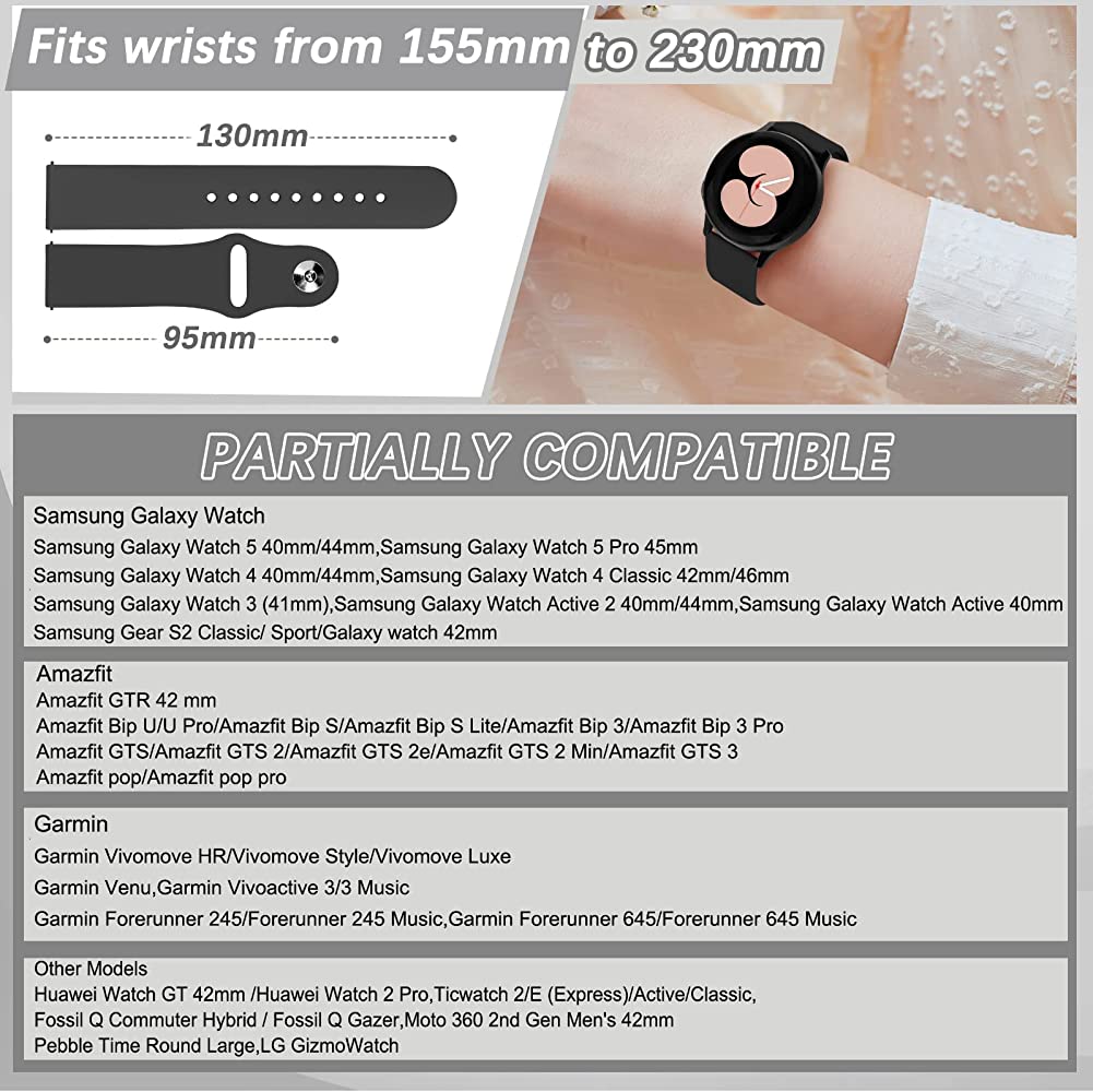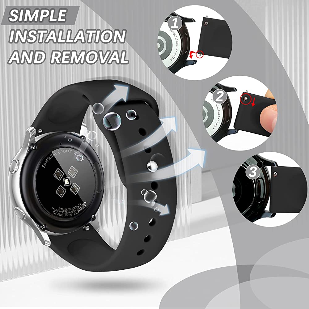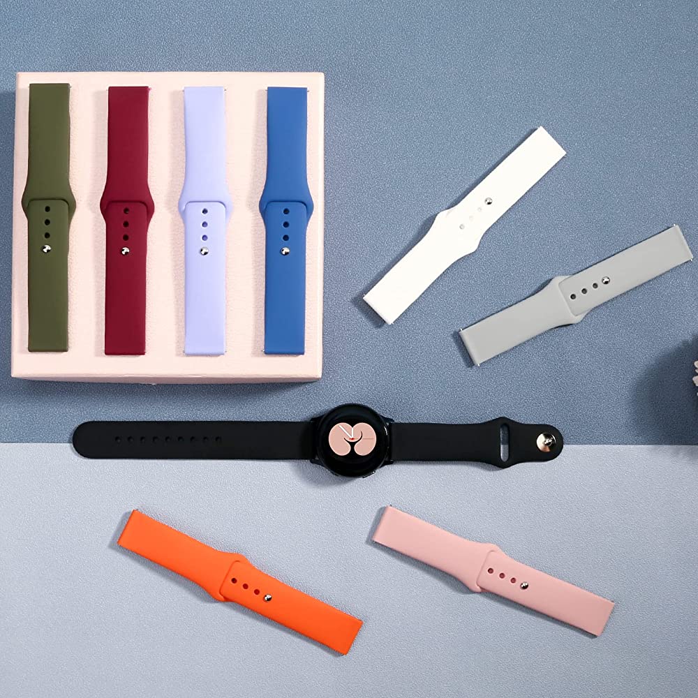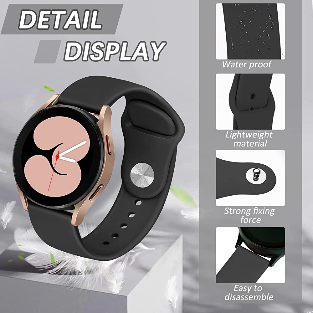 Sports silicone bands for Samsung Galaxy watches, available in a 10-pack. Compatible with Galaxy Watch 5/4 44mm 40mm, Galaxy Watch 4 Classic 46mm 42mm, and Galaxy Watch 5 Pro Band 45mm. Waterproof and adjustable with quick release feature.