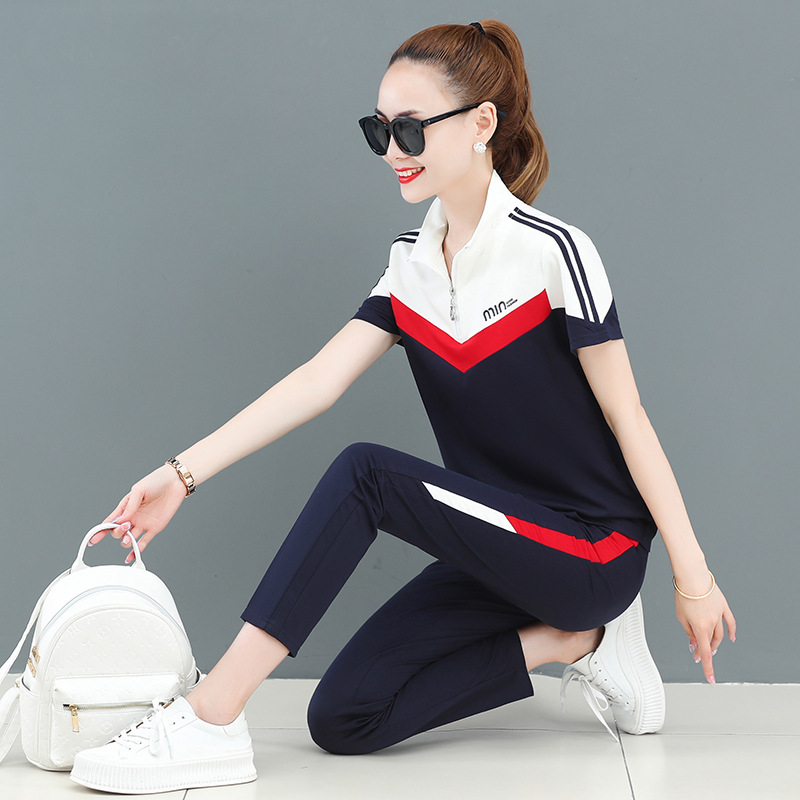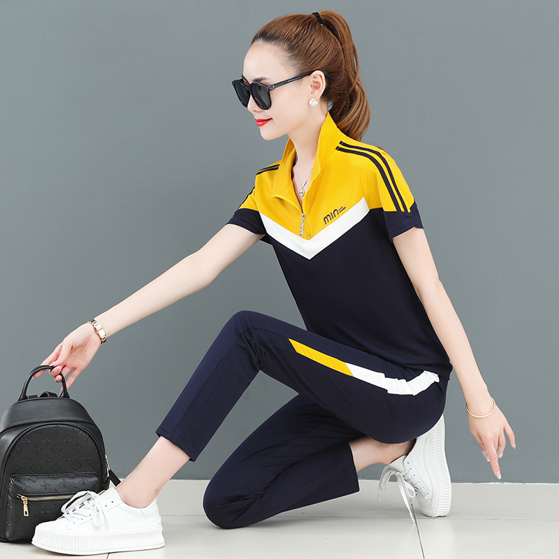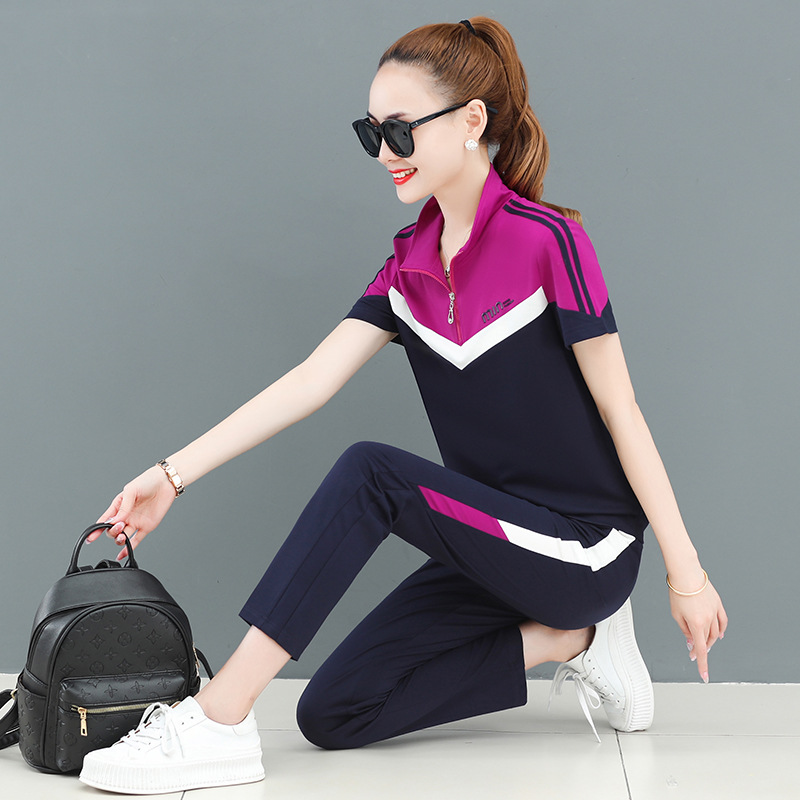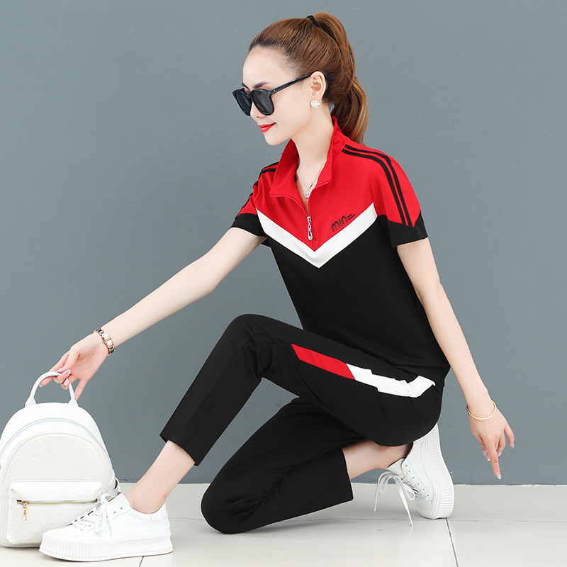 Sports Suit Women’s Summer 2022 New Fashion Brand Stitching Short-sleeved Trousers Large Size Running Clothes Casual Two-piece Set