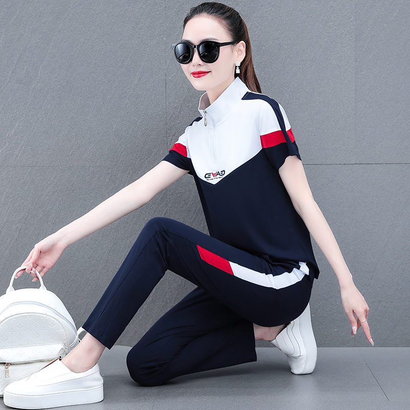 | nameOriginal | Sports Suit Women's Summer Casual Two-piece Fashionable 2023 New Loose Color Matching Collar Short-sleeved Running Suit |