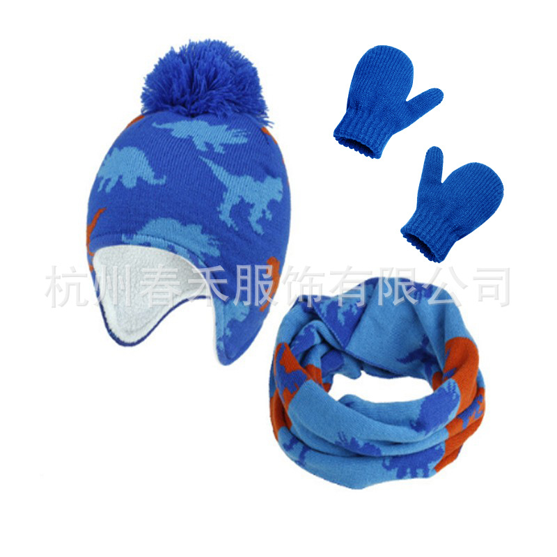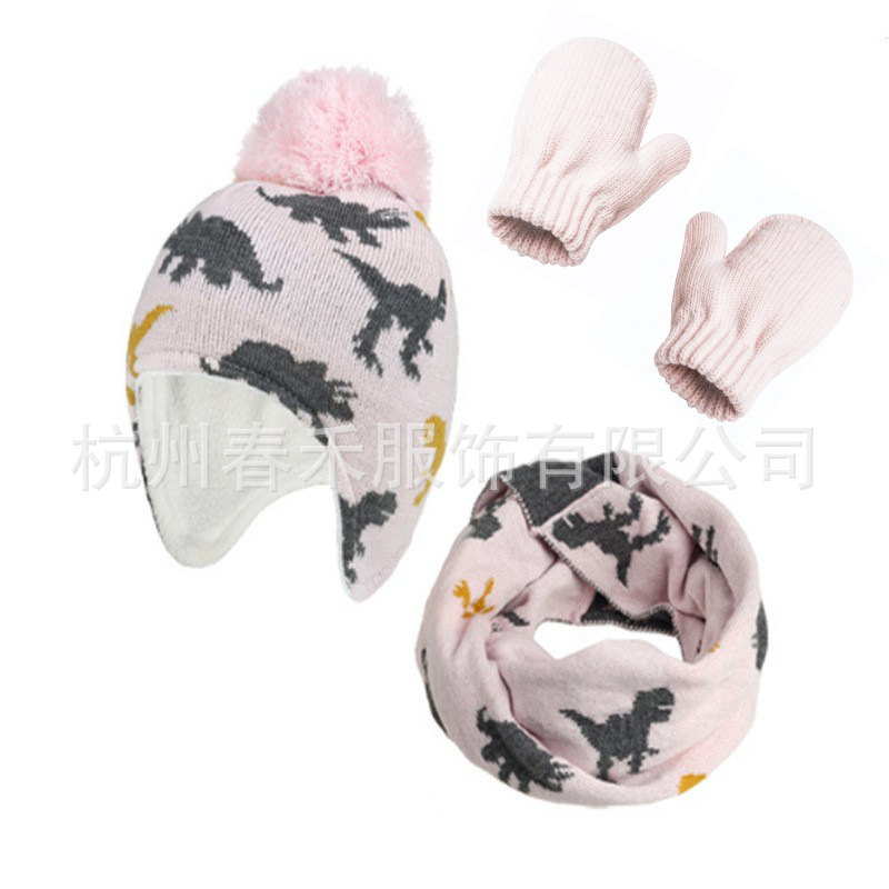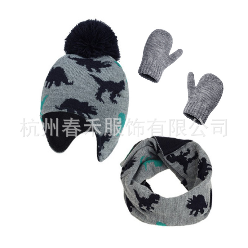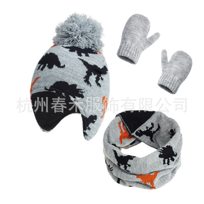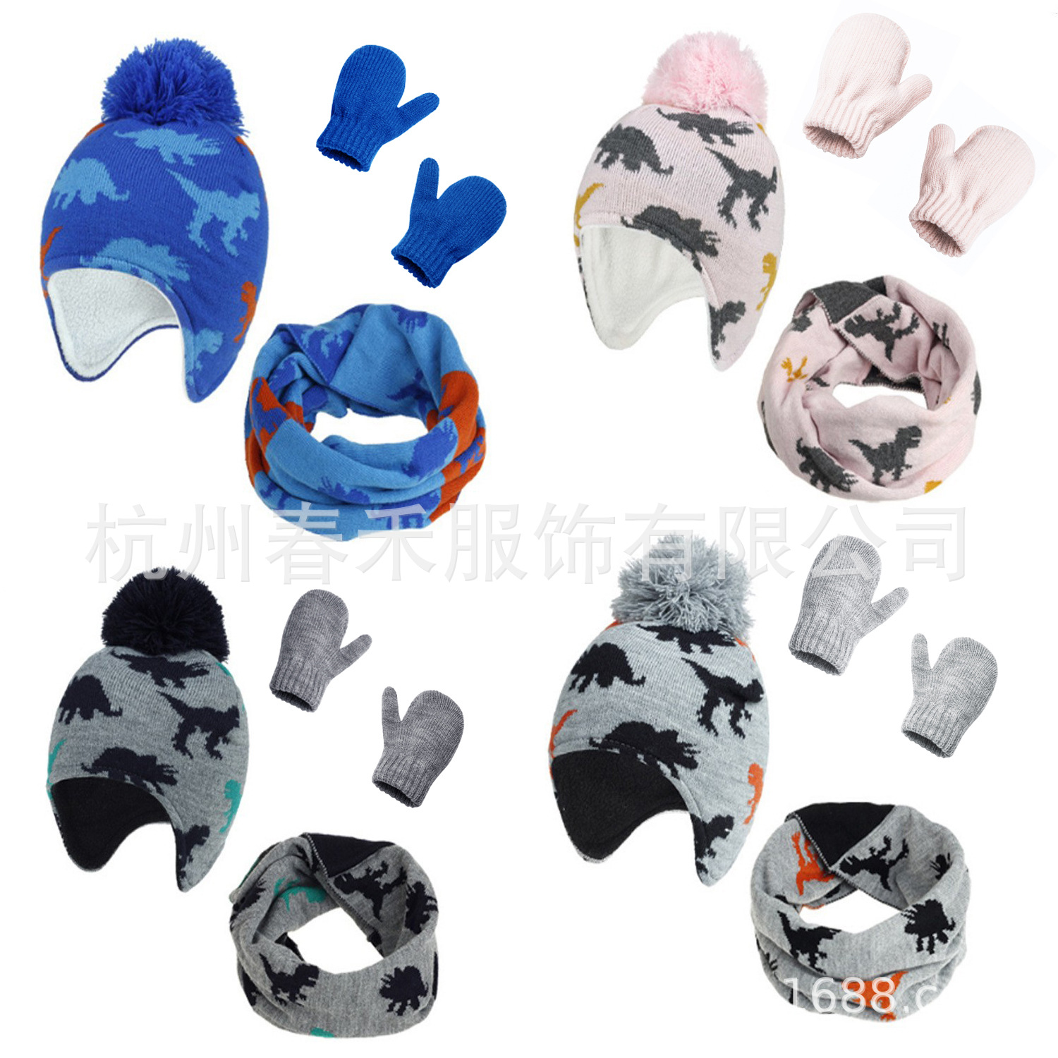 | nameOriginal | Spot 4-color cross-border explosion cartoon dinosaur hat bag set Baby Children's knitted hat gloves scarf 3-piece set |
