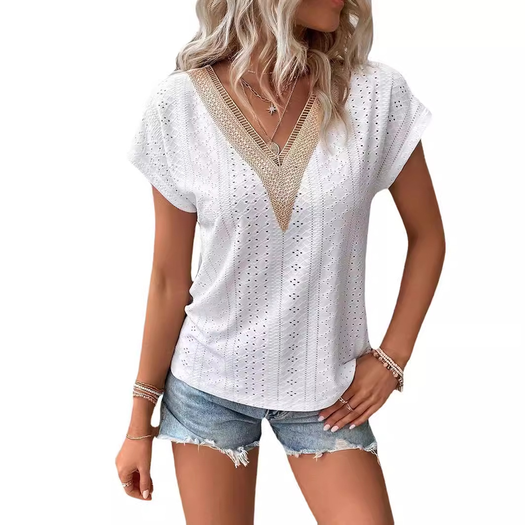 | nameOriginal | Spot Amazon 2023 Summer Foreign Trade V-Neck Lace Stitching Jacquard T-Shirt Explosion Loose Casual Women's Top |