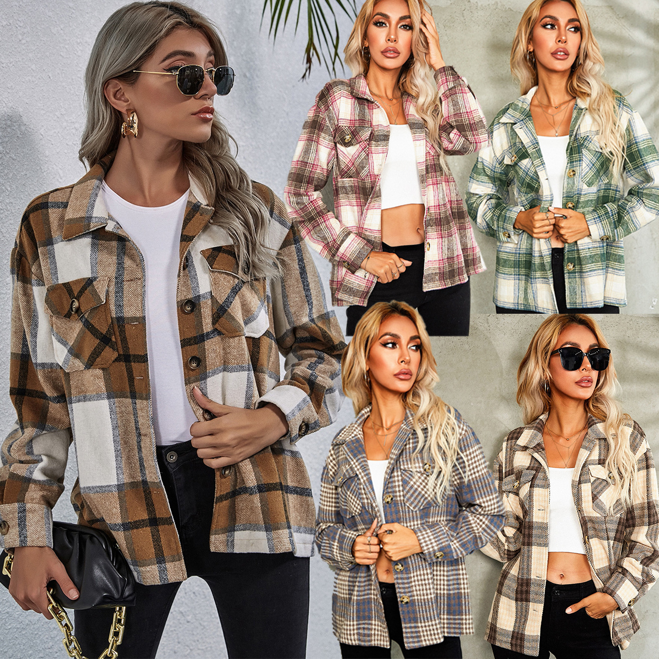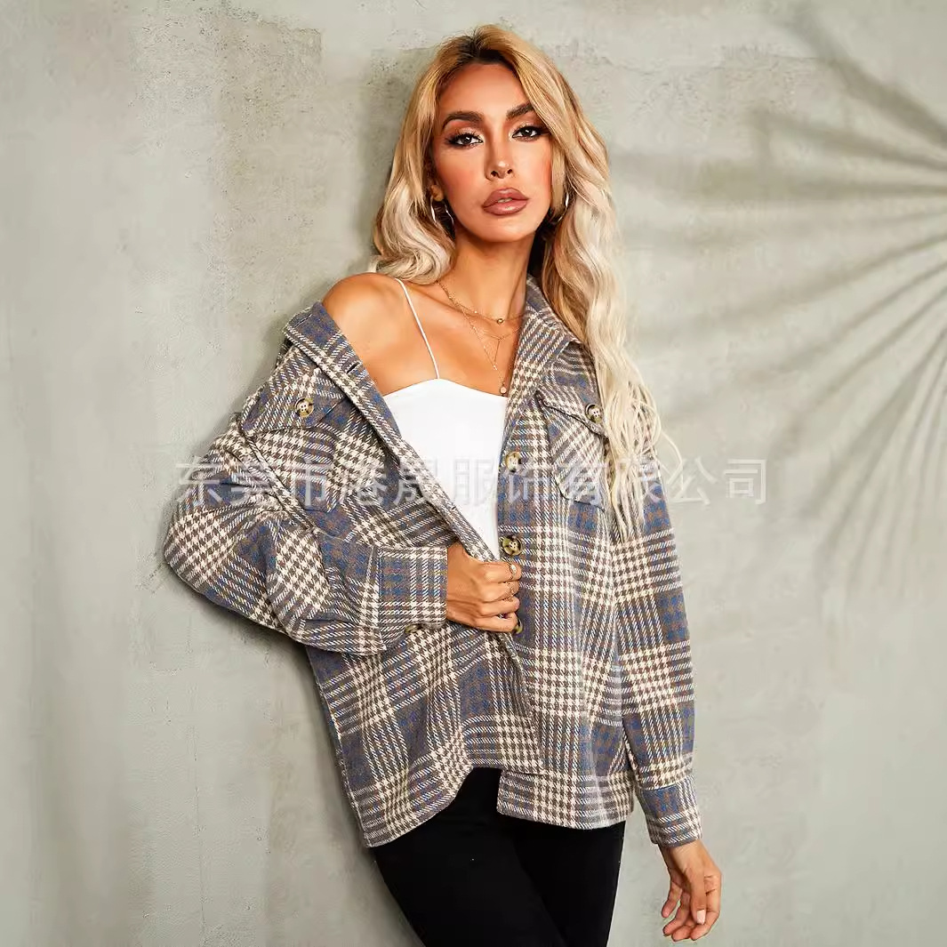 | nameOriginal | Spot cross-border Amazon independent station autumn and winter woolen collar shirt loose OL commuter women's plaid coat |