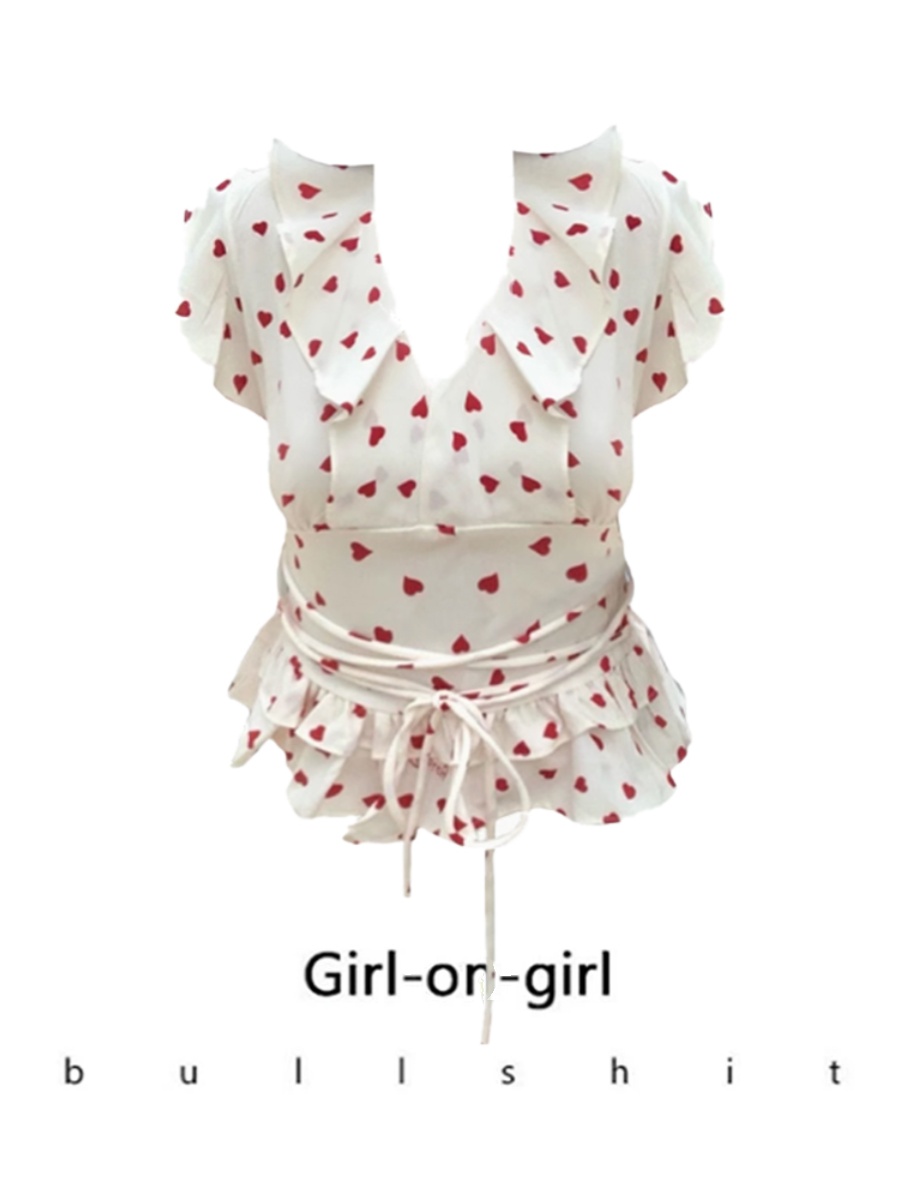 Spot goods! French sweet ruffled small flying sleeves love shirt women's summer waist-cinching lace-up short top