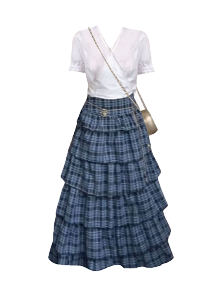 Spot goods! French white puff short-sleeved shirt for women summer design high-waist plaid skirt two-piece set