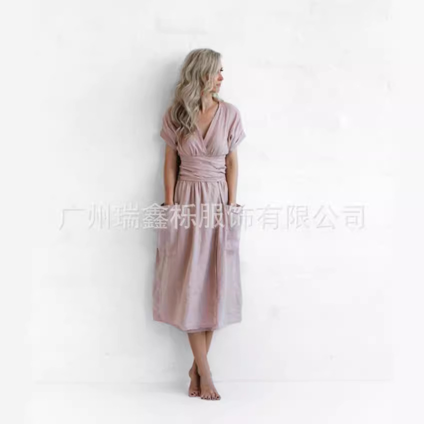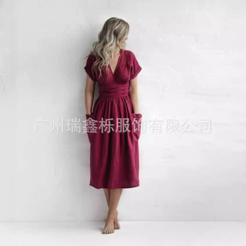 | nameOriginal | Spot independent station AliExpress cross-border hot summer new V-neck pocket belt solid color short sleeve dress |