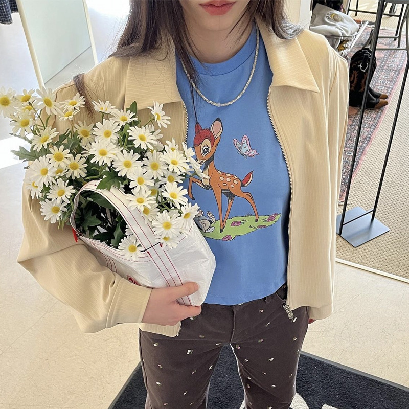 Spot Korean Women's Clothing Dongdaemun GROVE New Deer Printed Pure Cotton Round Neck Short Sleeve T-Shirt Short Top