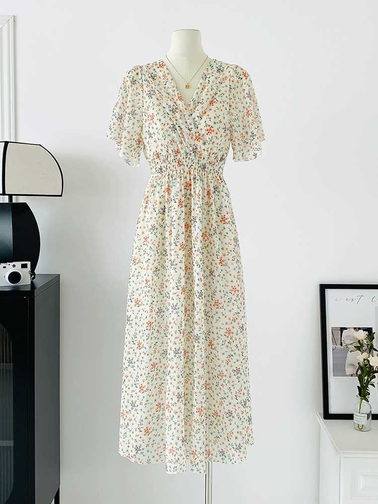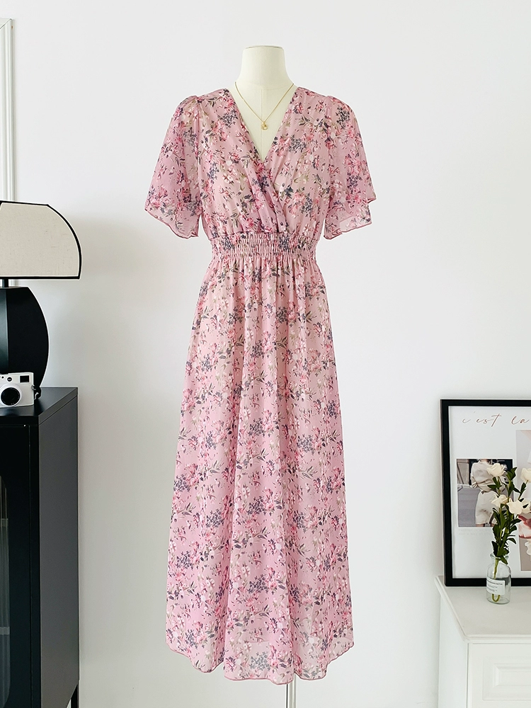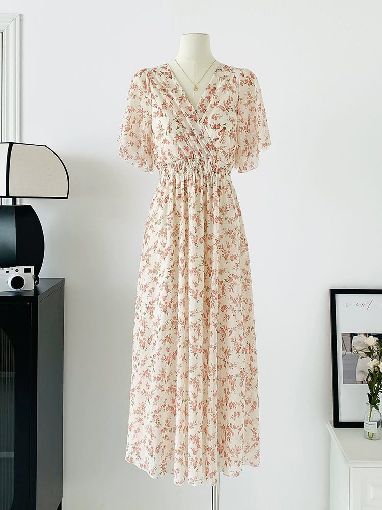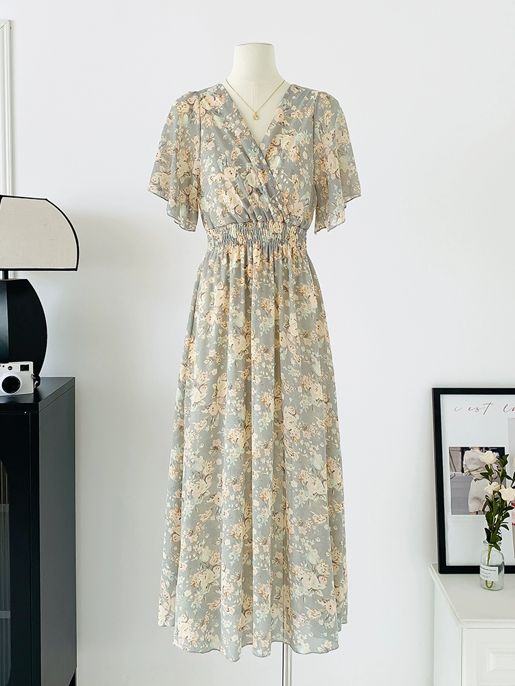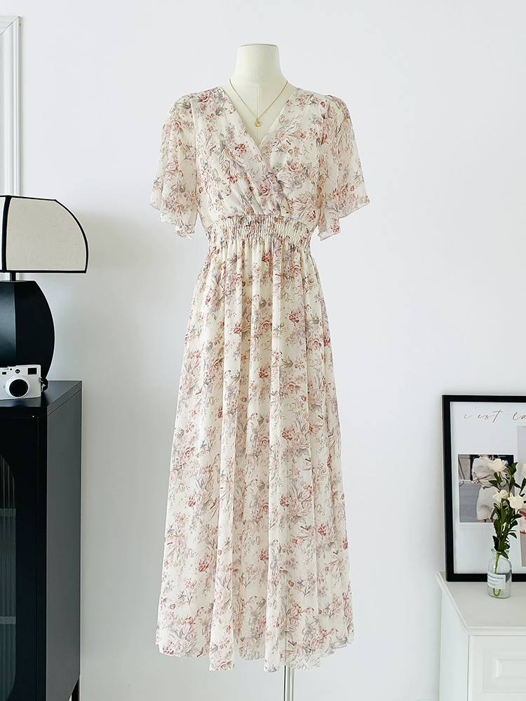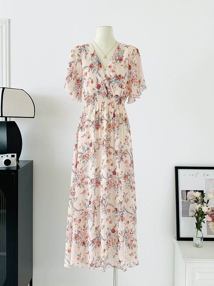 | nameOriginal | Spot real shot seaside vacation dress women's summer sexy V-neck waist slimming long chiffon floral beach dress |