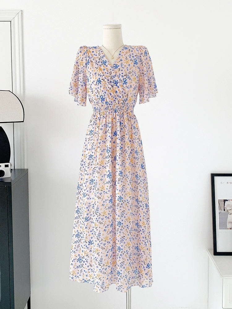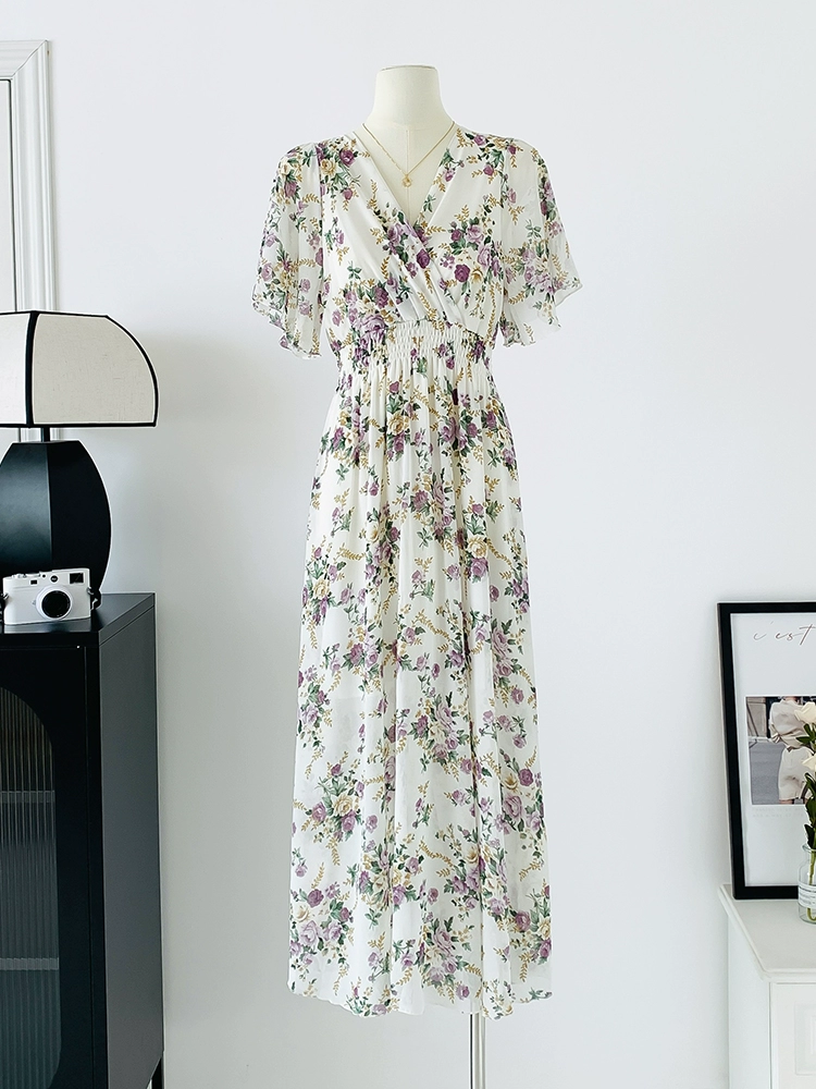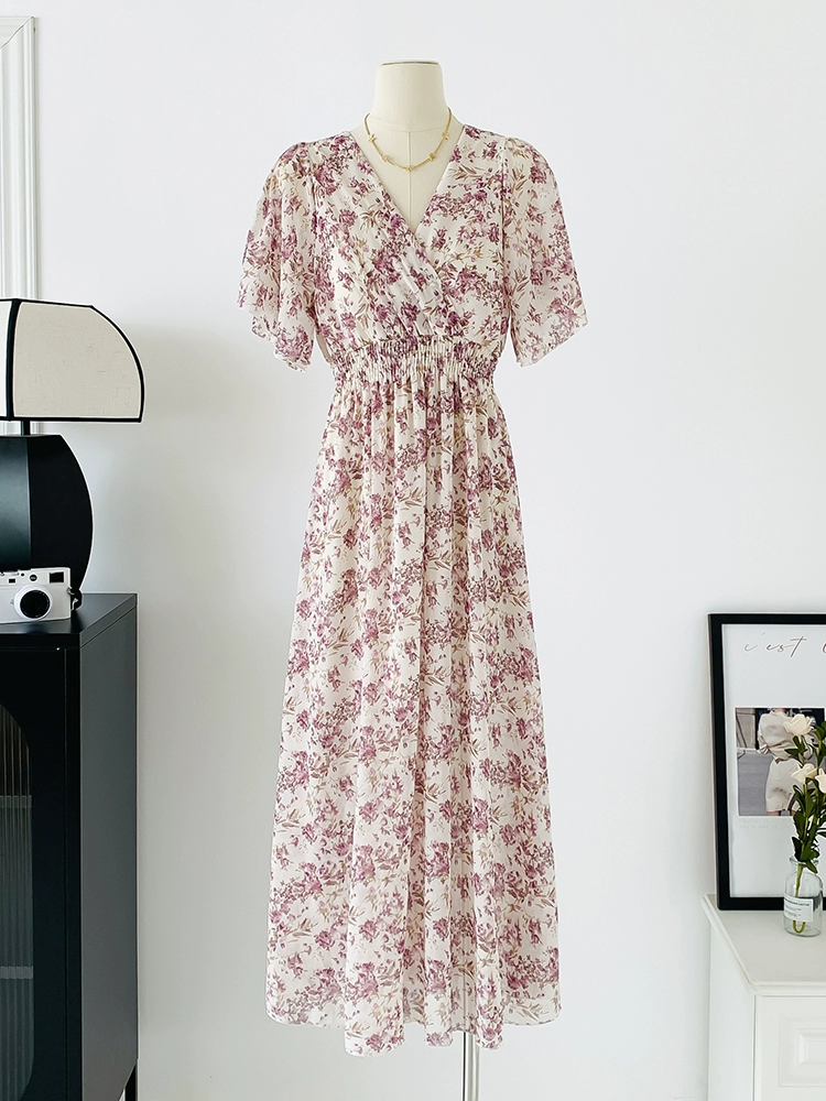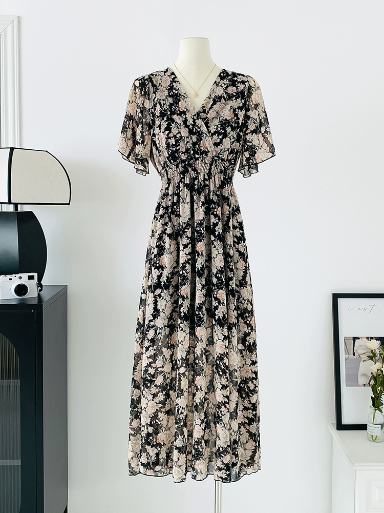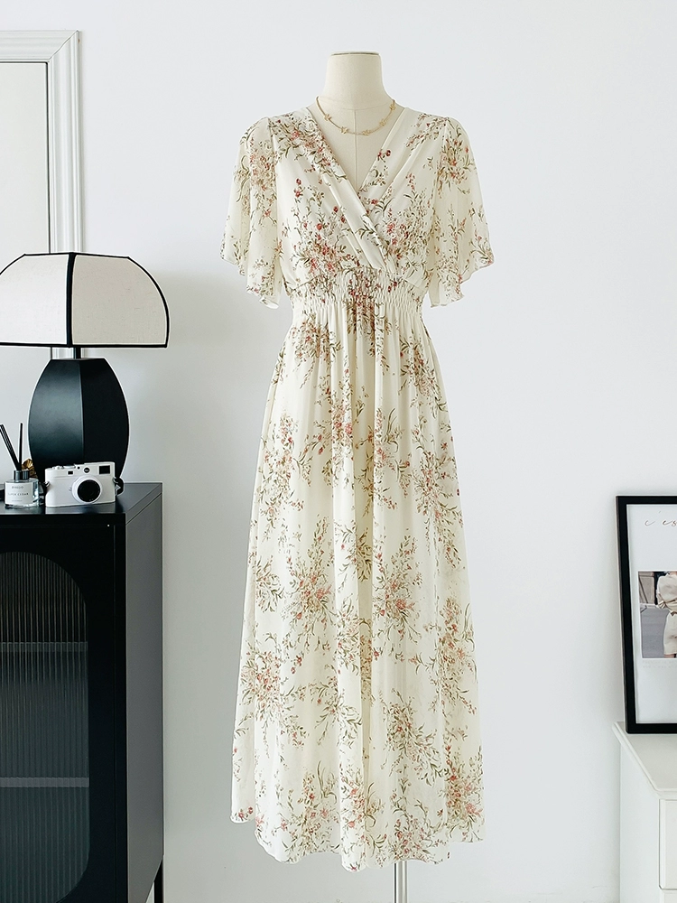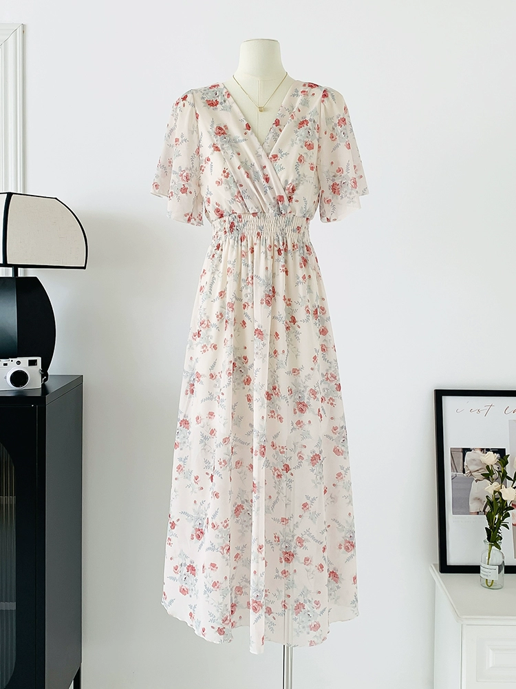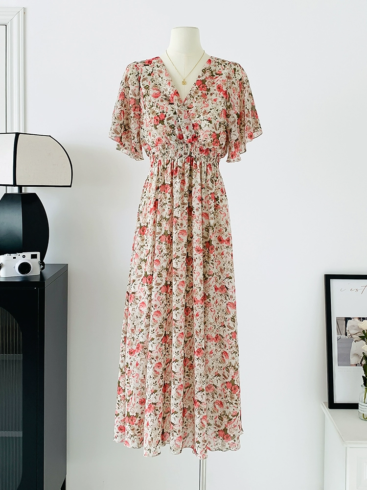 | nameOriginal | Spot real shot seaside vacation dress women's summer sexy V-neck waist slimming long chiffon floral beach dress |